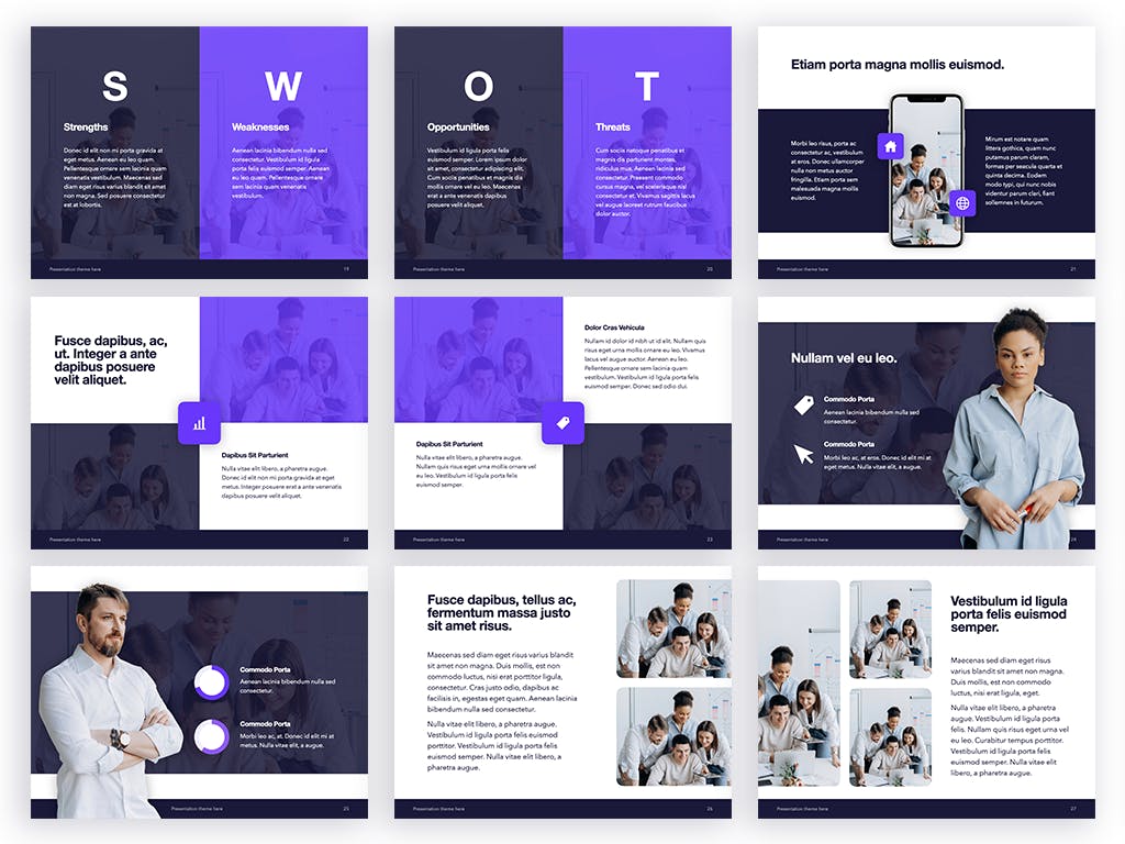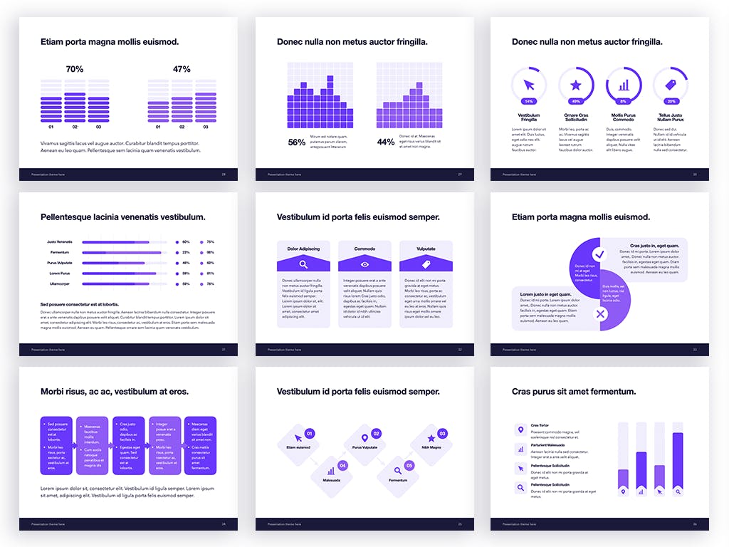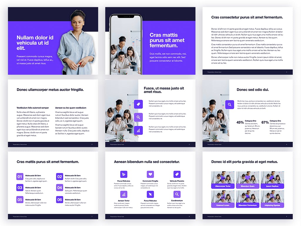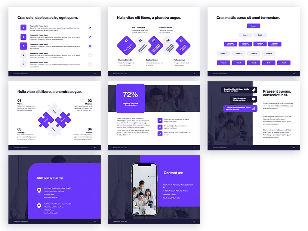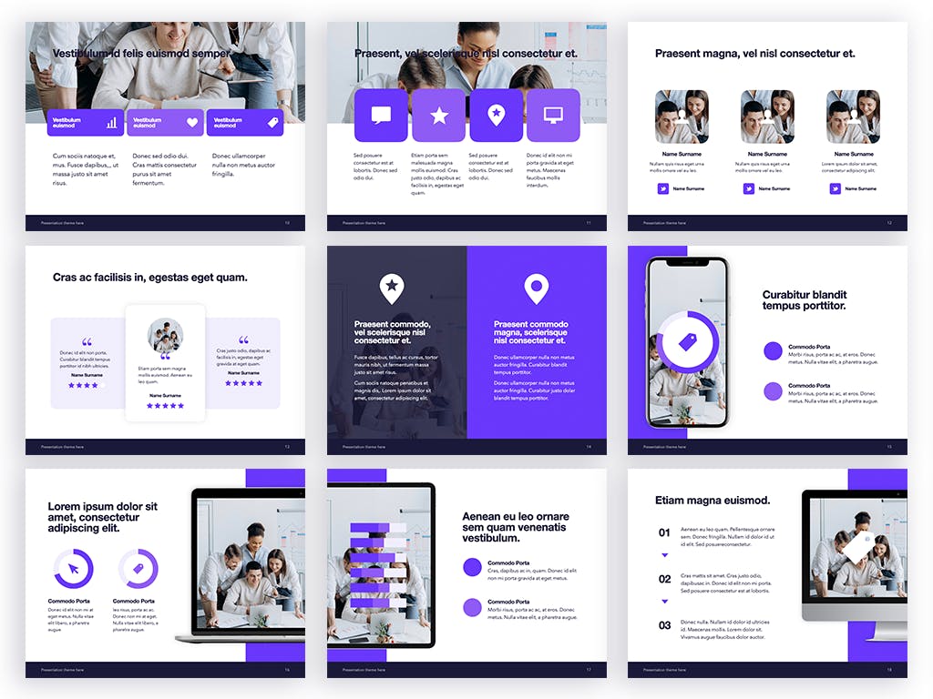 今天分享这款紫色主题的PPT设计模板,创意精美商务办公,适合用于会议展示、销售、品牌等等。