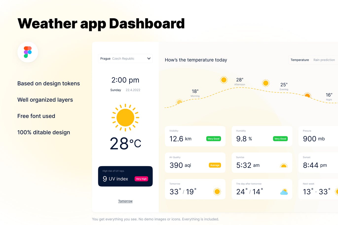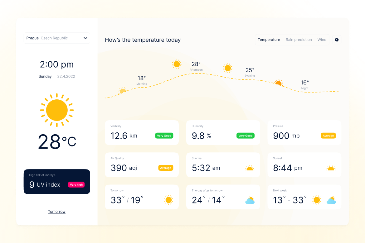 我想向大家展示我的新天气应用程序仪表板,它组织良好,基于颜色、文本样式和阴影等设计标记。还有免费字体。