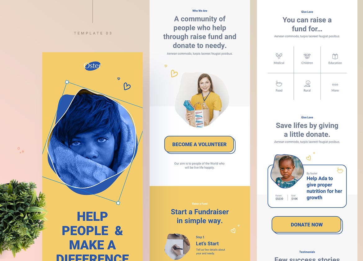 寻找新鲜,现代设计的非营利电子邮件模板?奥斯特在这里等你。它是专门为那些专注于为慈善事业筹集资金,以及慈善、活动、社区、捐赠、非政府组织、筹款、非营利和其他目的的组织而设计的。该模板以其独特、现代和诱人的设计帮助您实现目标,并促进您的捐赠。