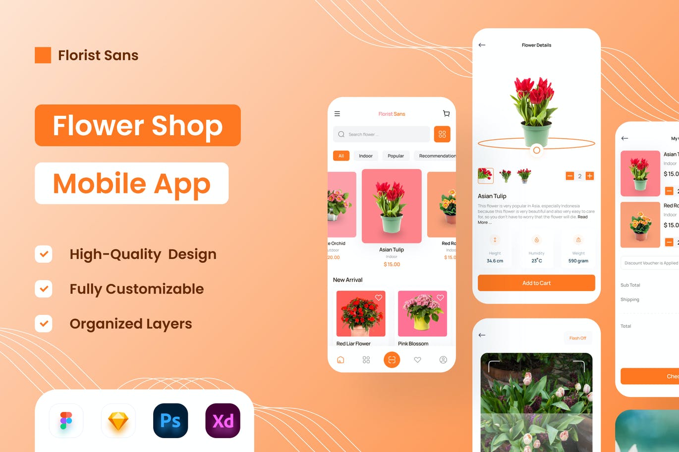 **Flower Shop Mobile App-UI Design**是一款适用于IOS和安卓系统的现代花店移动应用程序设计UI套件,设计时尚,可用于下一个项目,实现你的梦想。