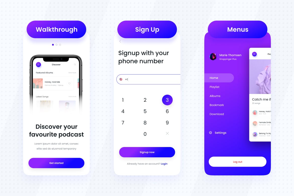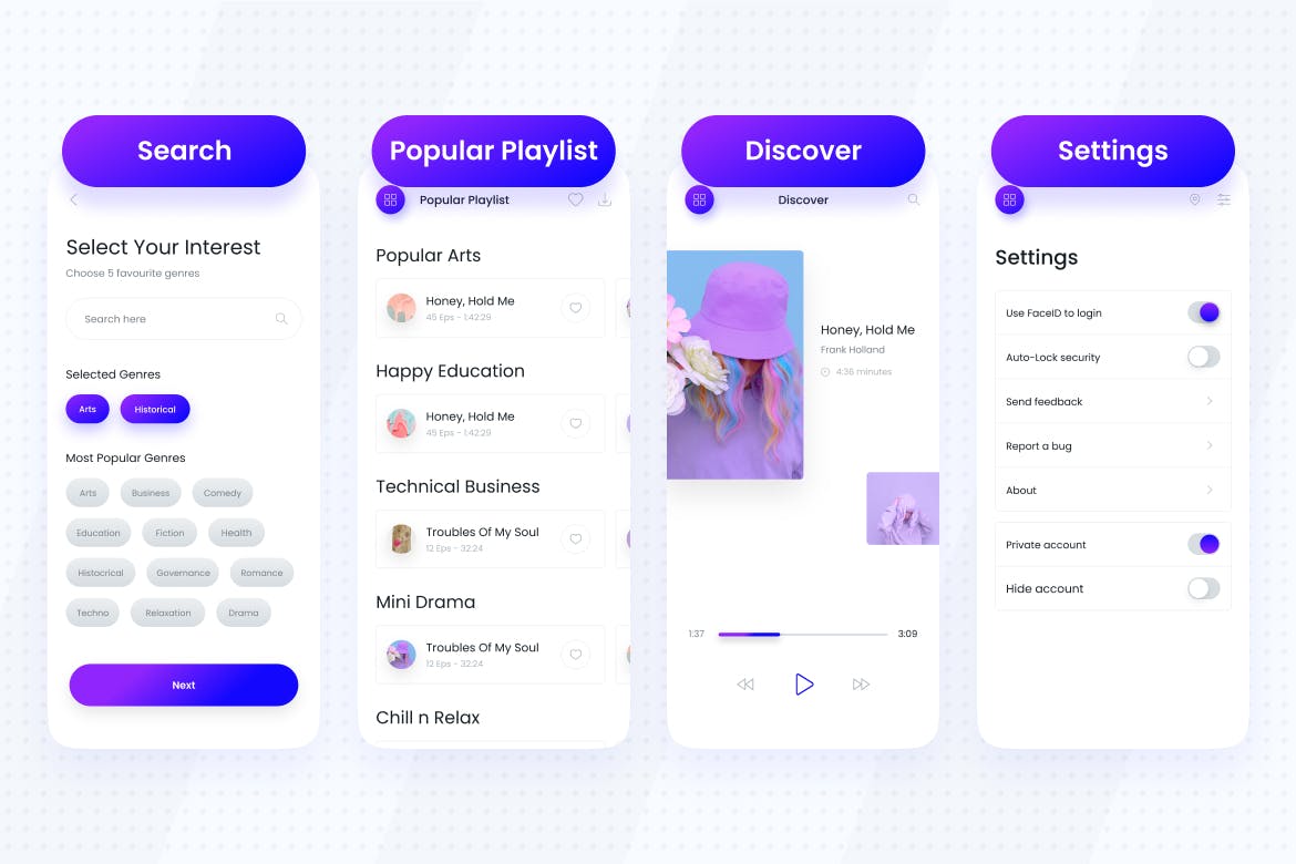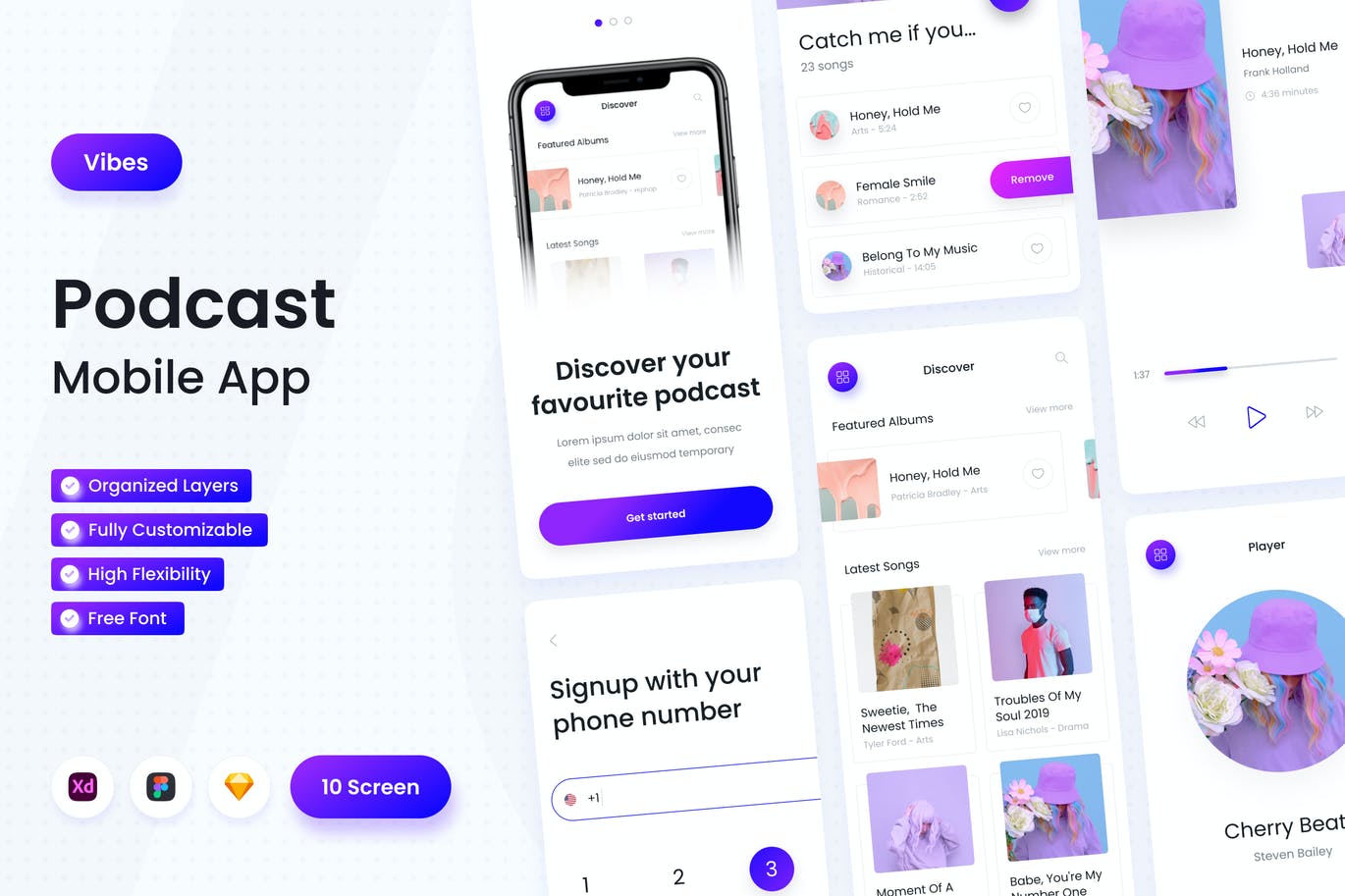Vibes是一款现代且干净的播客移动应用程序UI套件,用于为电台、数字媒体、播客媒体、互联网广播、流媒体服务、娱乐或视频博客网站创建移动应用程序。