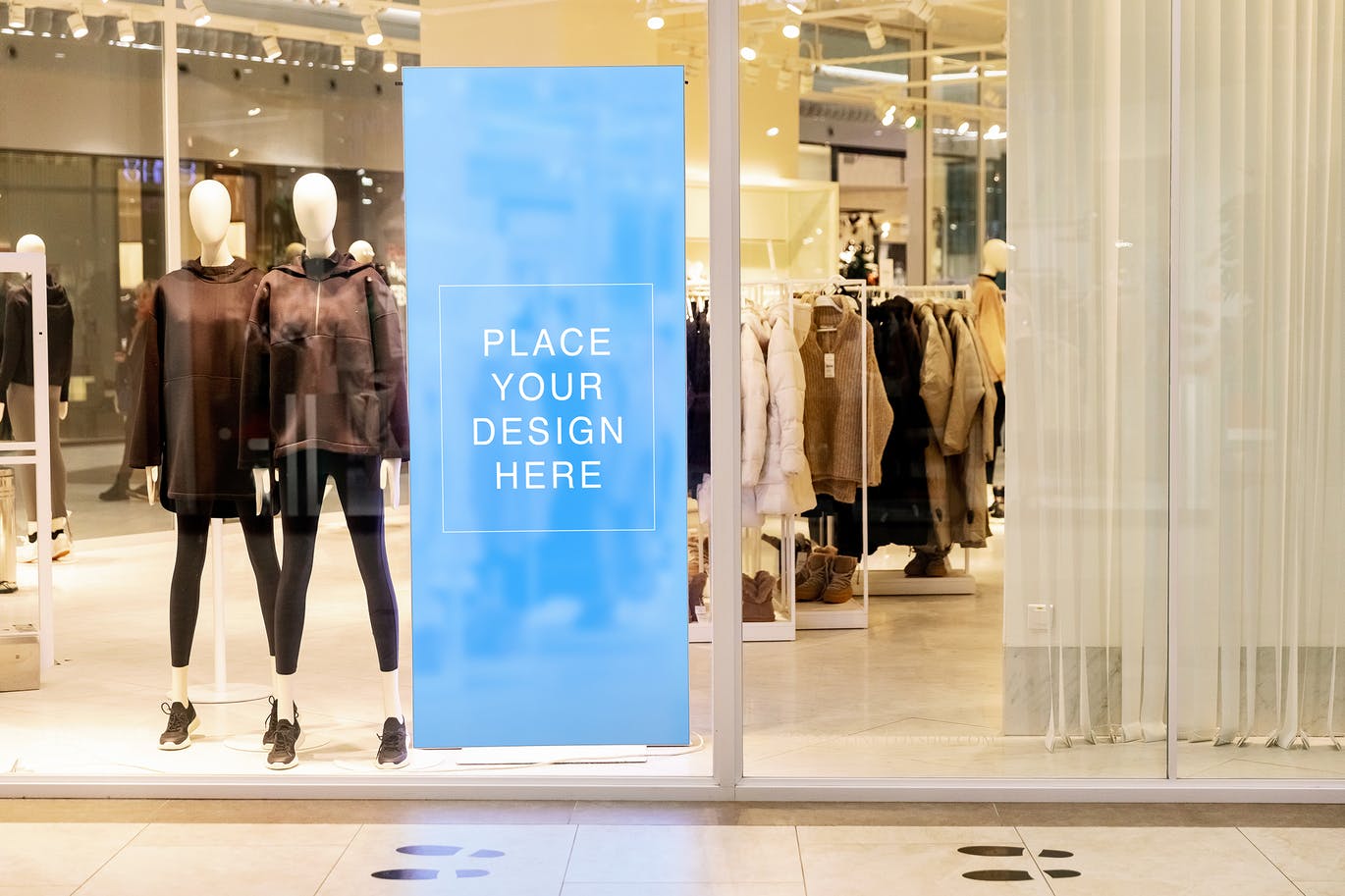 购物中心屏幕窗口显示、灯箱、海报样机,用于展示您的活动、海报设计、广告、艺术品、电影、节日等。