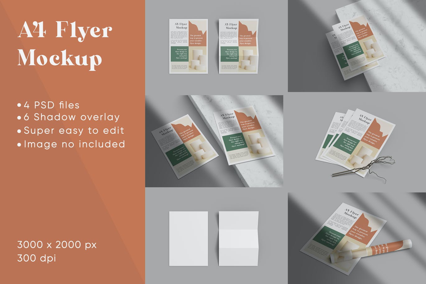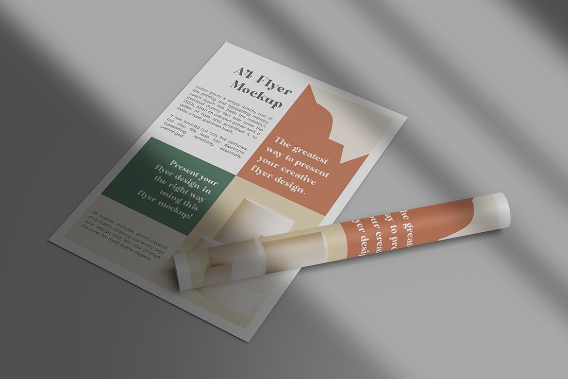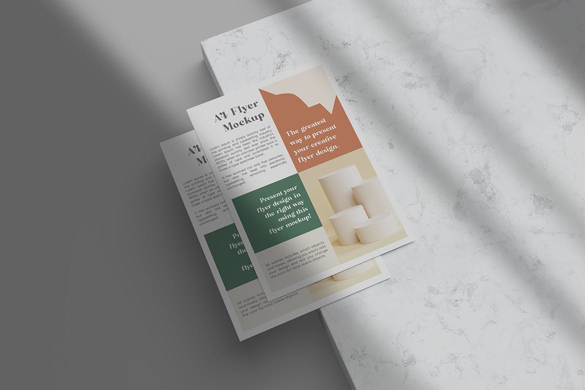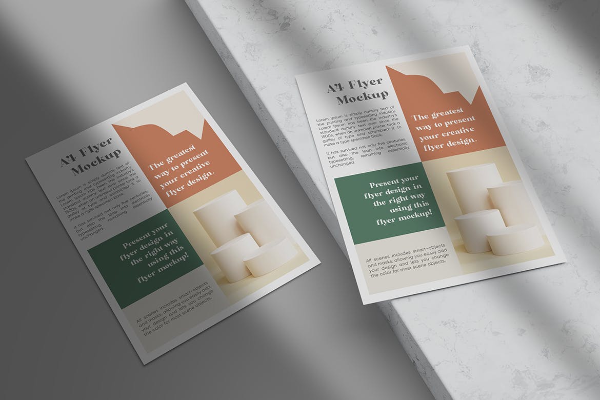 这是一个A4传单/纸张样机,你不需要任何Photoshop技能,只需将你的设计放入智能对象中,它就会自动更新传单样机。