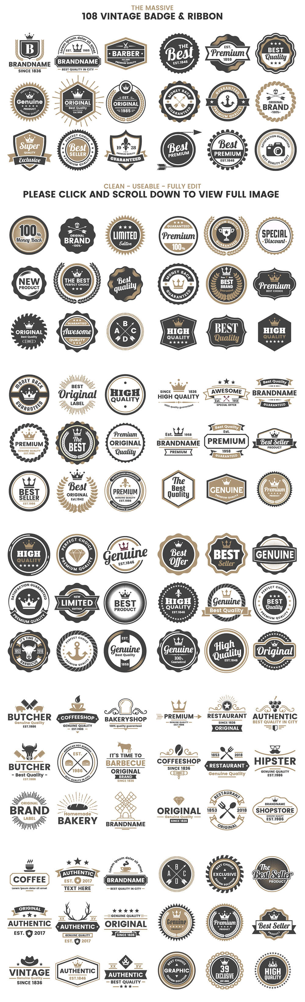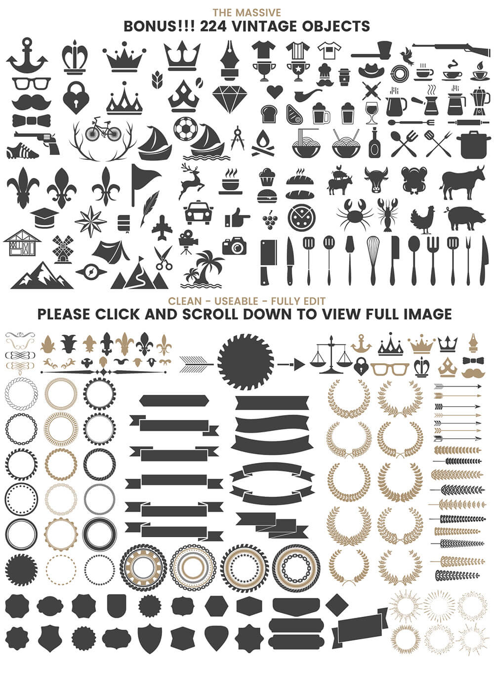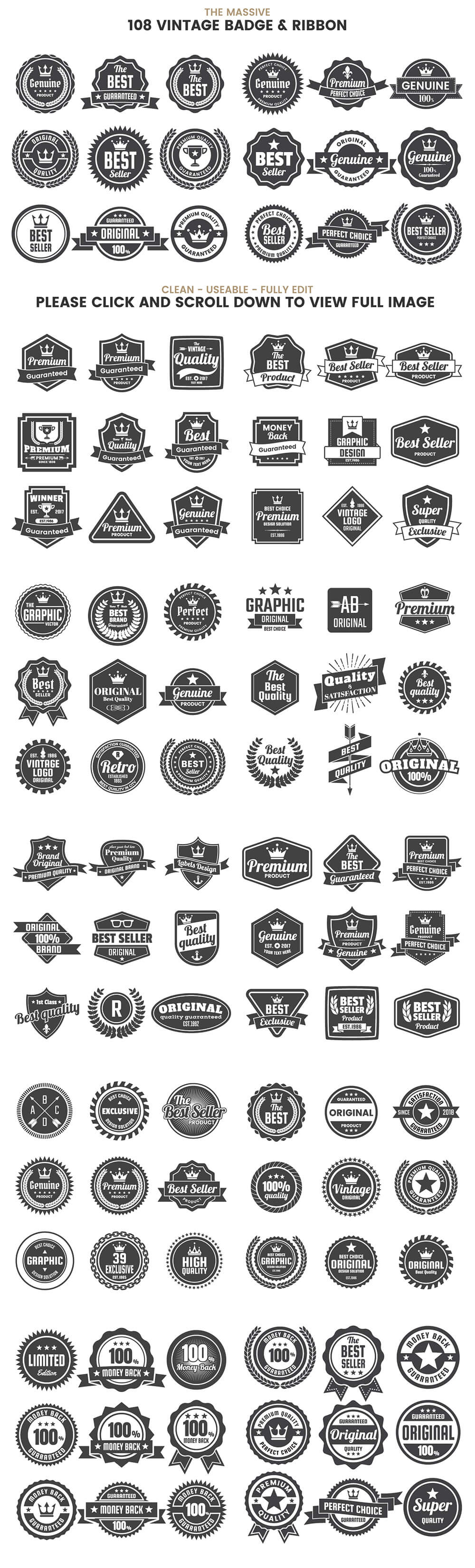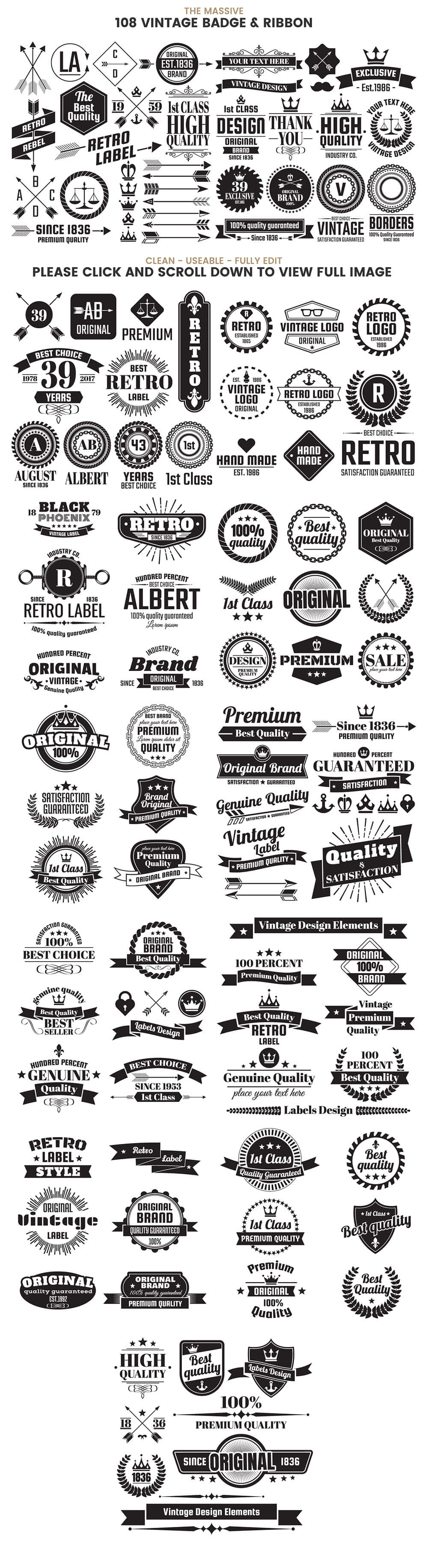 复古徽章和物件图形素材包,其中包括许多不同样式的元素,可完美应用到T恤、图案、印刷等项目上,包含3种不同格式的文件。