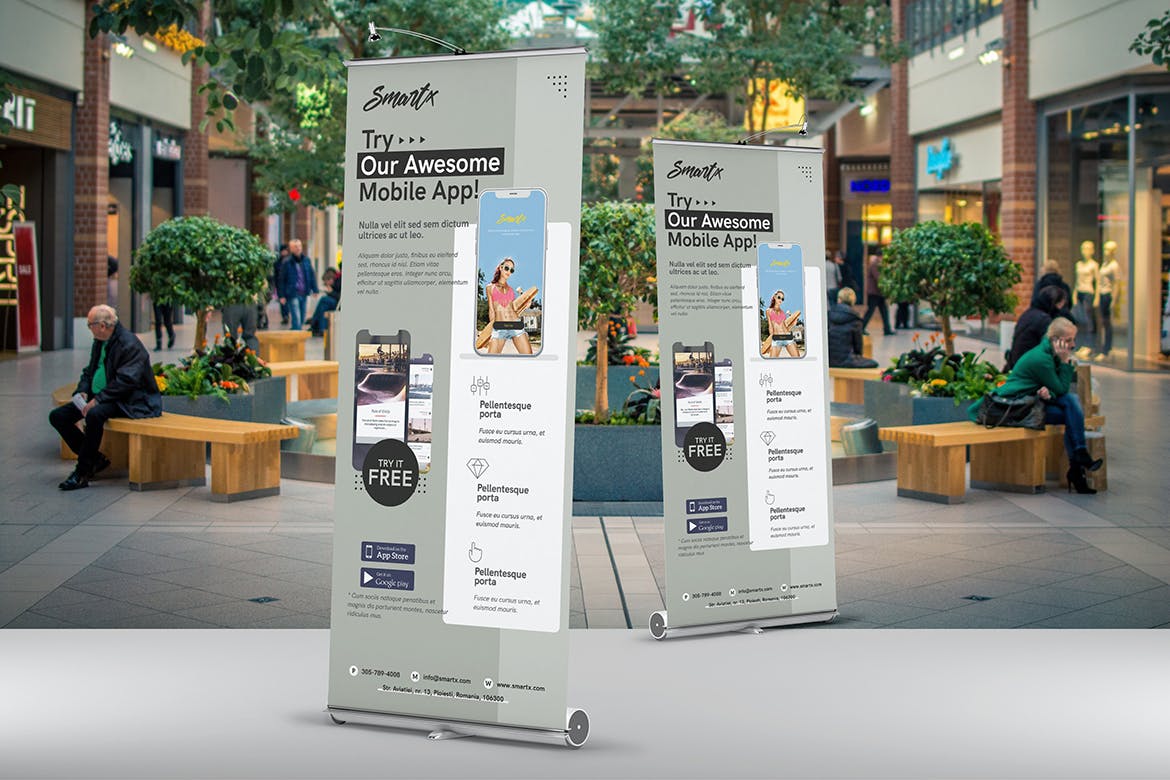 这次老不湿分享的是,时尚高端多用途的手机APP应用程序X展架易拉宝门型架设计模板-PSD,移动应用汇总横幅-移动软件,电话应用开发人员的模板设计。