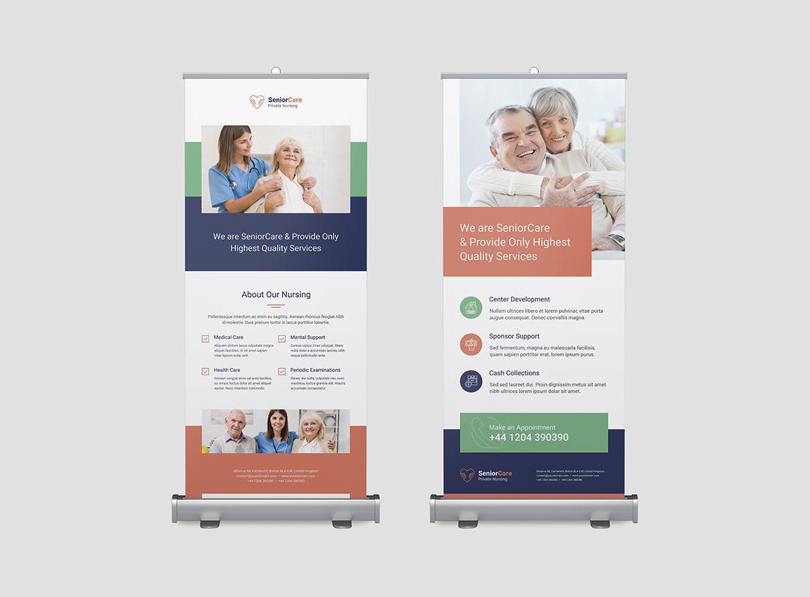 这次老不湿分享的是,简约时尚好用的居家养老护理养老院敬老院X展架易拉宝门型架设计模板(PSD,INDD),旨在促进与老年护理,疗养院,老年人护理,图表和分析,捐赠,慈善机构,筹款人等相关的服务。