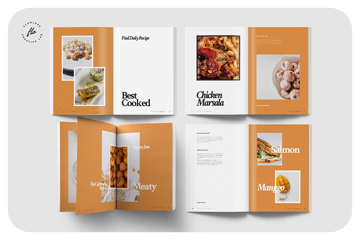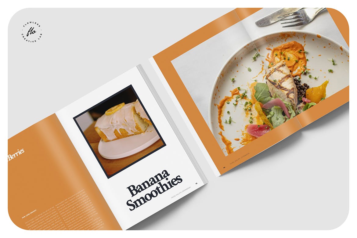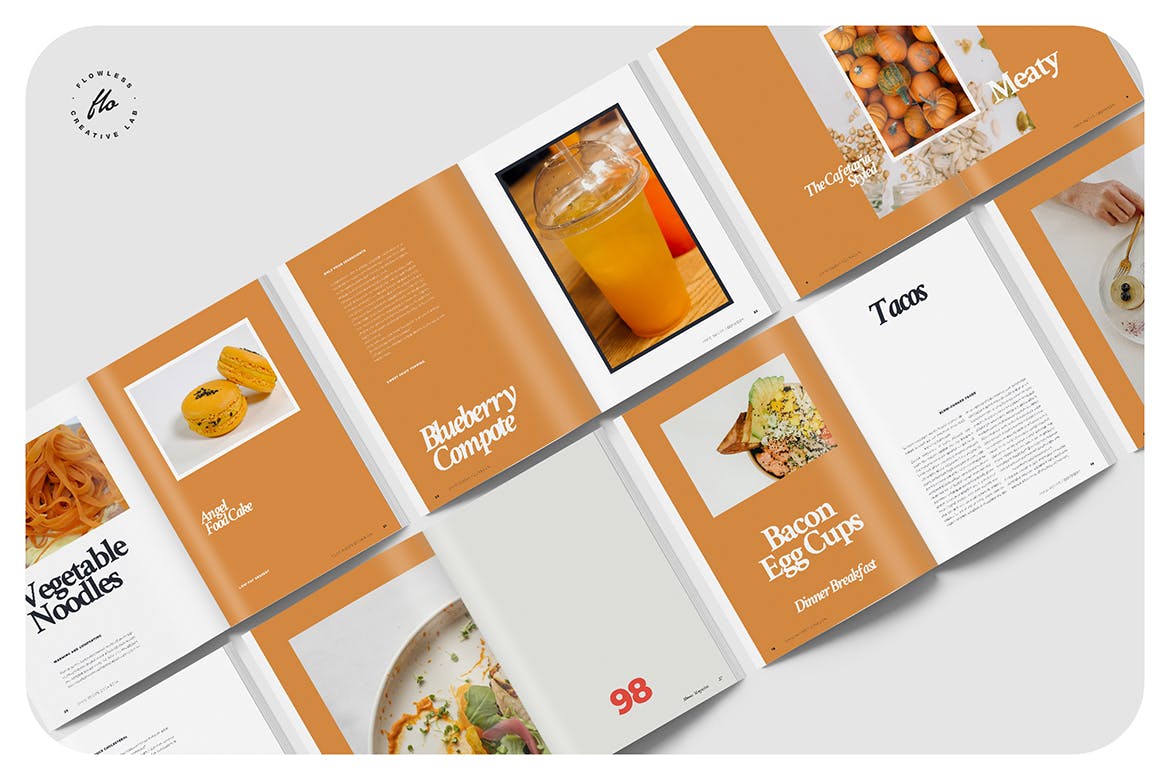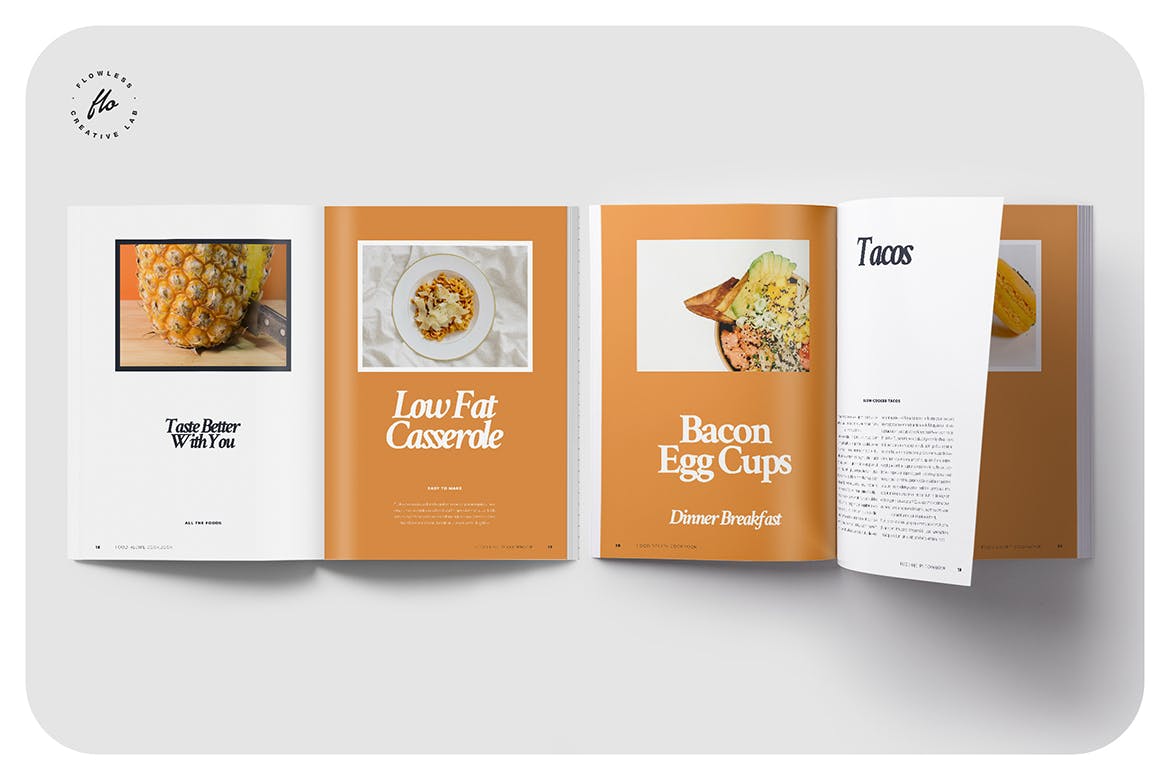 今天介绍一款美食杂志画册模板,极简个性排版,各种美食图片展示在册,可用于美食杂志。