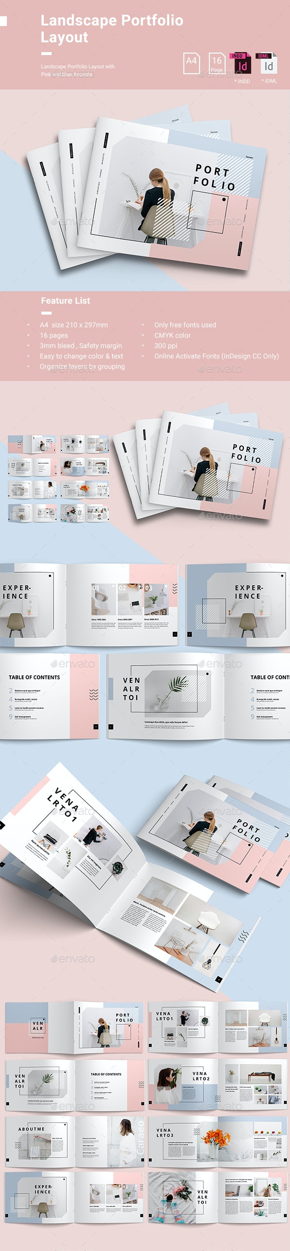 以粉色和蓝色为主题设计的A4横版规格作品集产品杂志画册模板,A4尺寸,包含16个页面,易于更改颜色和文字;完全可编辑–添加您自己的文本或图像;使用免费字体;CMYK颜色。