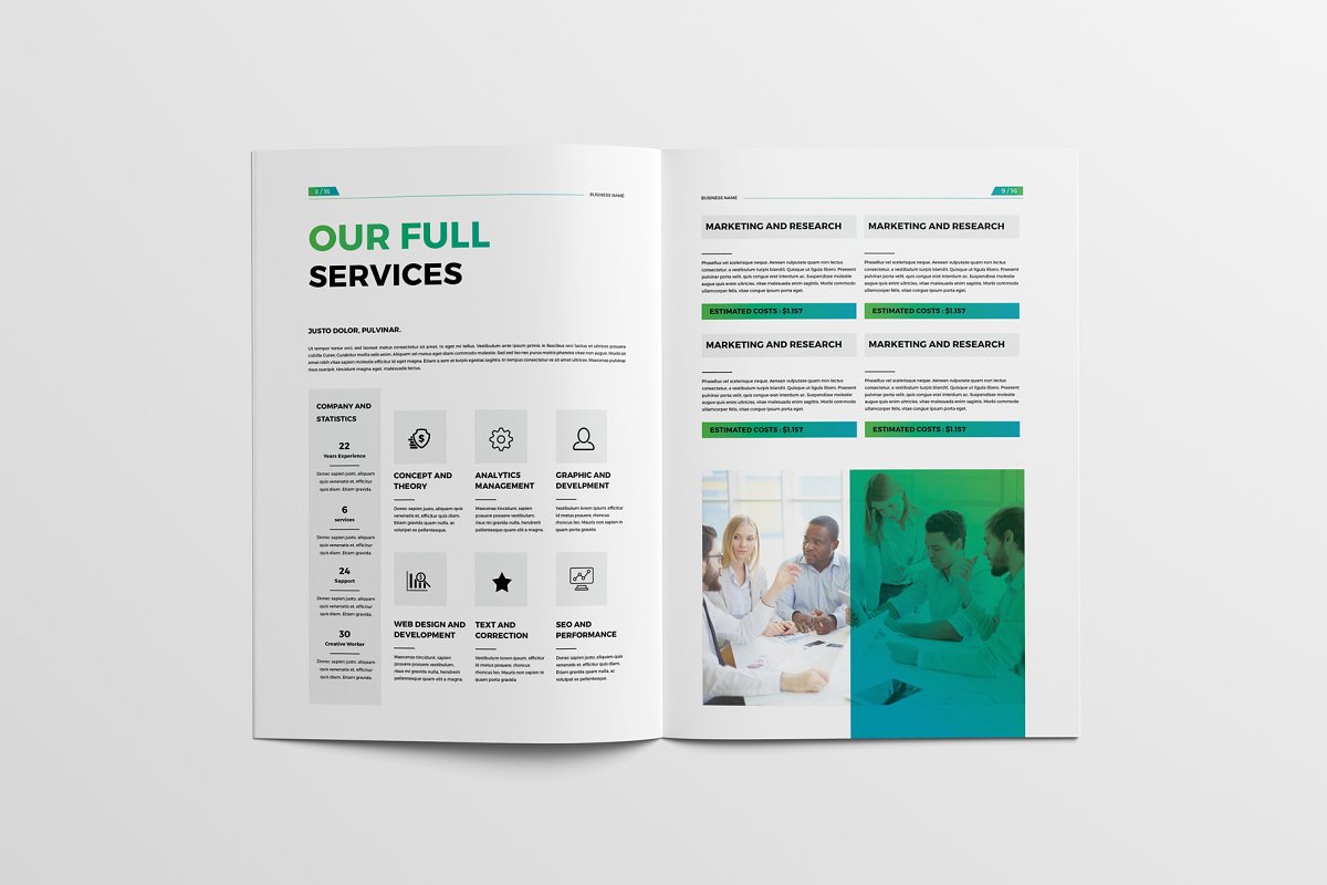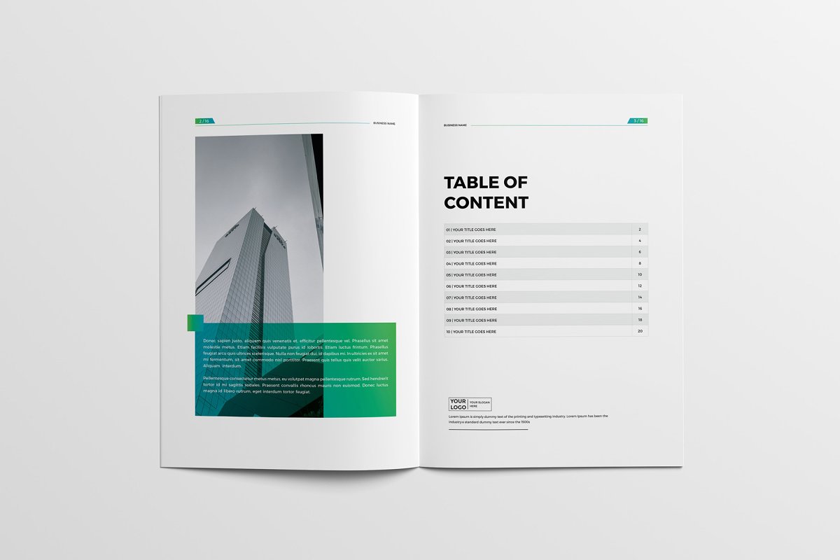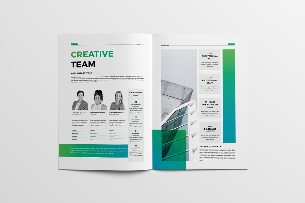 这是一个干净且易于使用的工具。易于编辑,您可以一次更改整个文档中的绿色强调色,包括段落和字符样式,文本和图像放置在单独的图层上,文本与网格对齐。它是垂直设计,A4尺寸(21×29.7cm),包含16个页面。