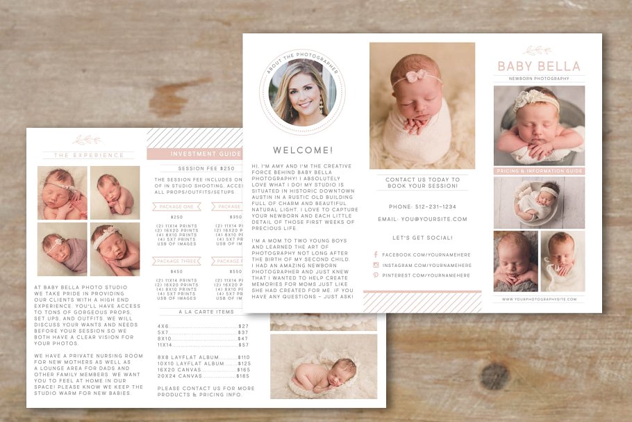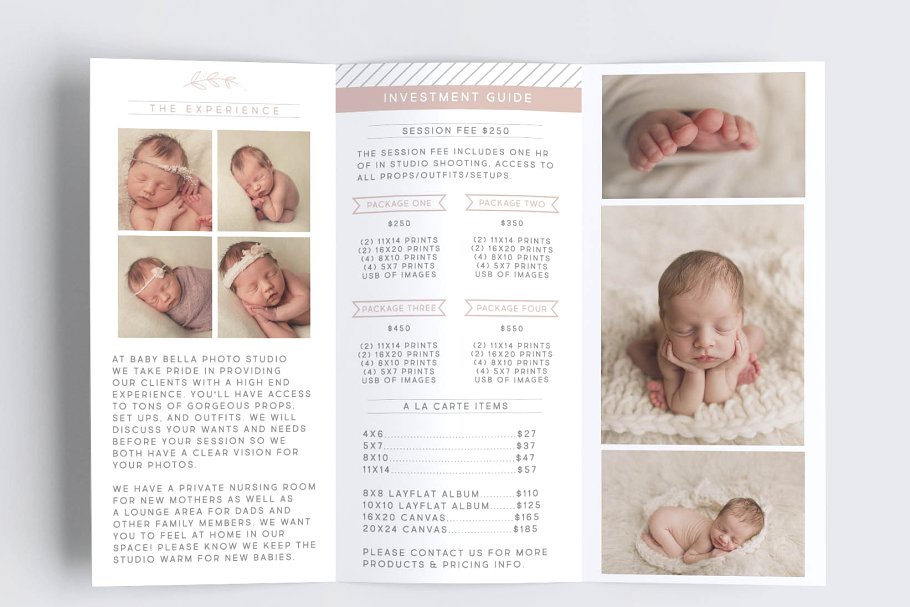 这是一个干净和别致的8.5×11三折页的价格指南,可以用一个专业的方式显示您的价格和会话信息。