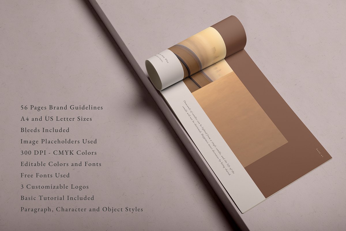 这是专为InDesign设计的完全可编辑的多用途品牌标识指南模板。它包括版式、徽标、照片库、调色板、图像、产品和品牌部分。您可以轻松地通过输入CMYK值改变整个模板的颜色。