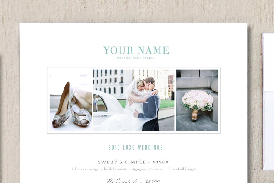 这个优雅的定价指南将给你一些脱颖而出的东西,以吸引你的理想客户。通过在Photoshop中轻松地改变颜色或字体,自定义本指南以适合您的品牌。