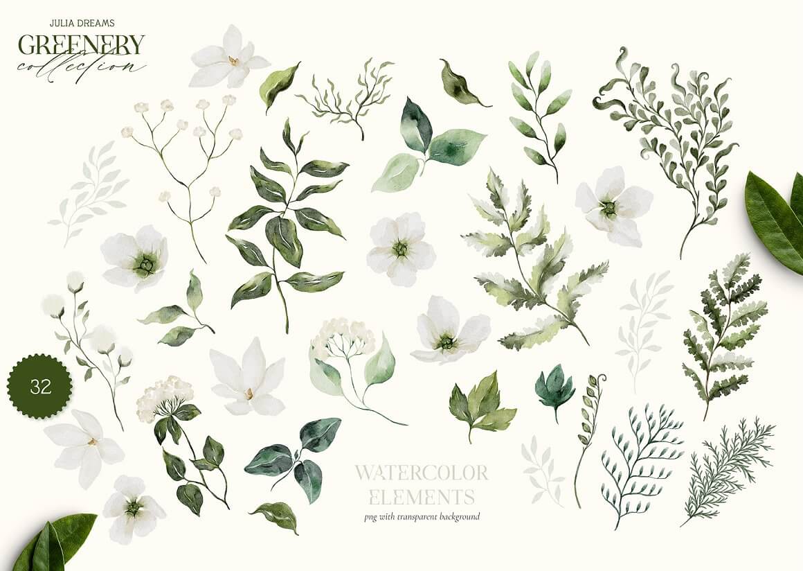 绿叶水彩是嫩花和绝对绿色水彩叶子的集合。手绘爱心水彩植物元素可以完美补充您的项目,帮助打造精致、内敛和时尚的风格。