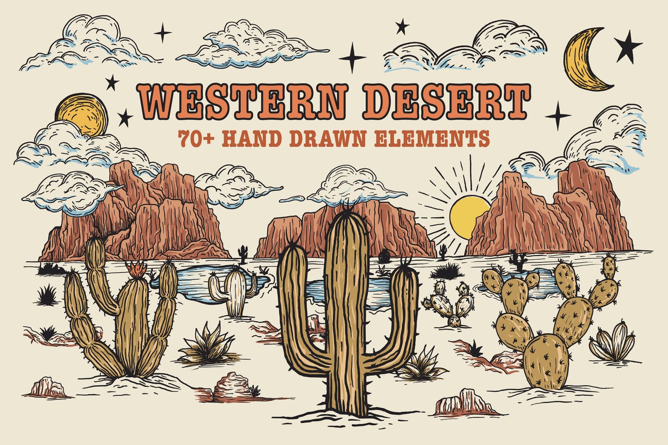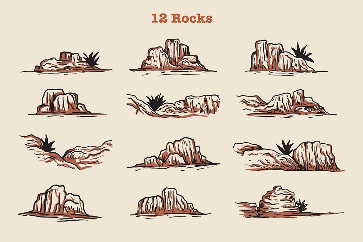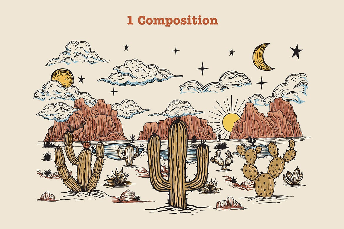 这次分享的是,时尚高端清新手绘美国西部沙漠元素插画大集合,包括 71 个元素。以仙人掌、山、水泉、岩石、草、云、太阳、月亮、星星为特色。设置手绘西部沙漠元素,非常适合徽标、品牌、艺术印刷品、包装、徽章、网络和社交媒体图形、海报、墙壁艺术、卡片、剪贴簿、纹身设计、表面图案设计、壁纸等!