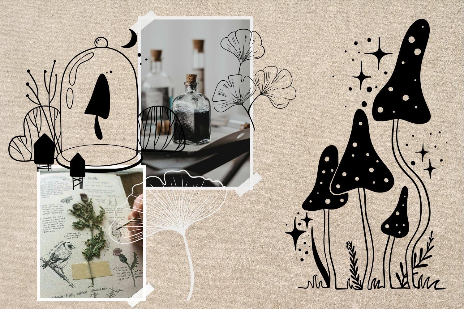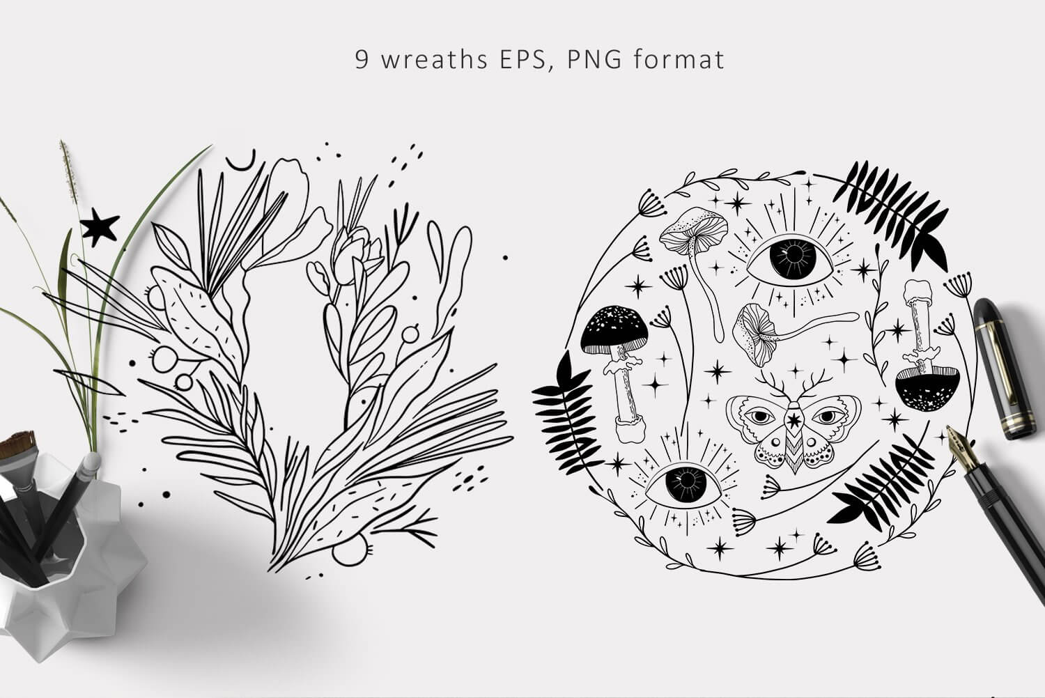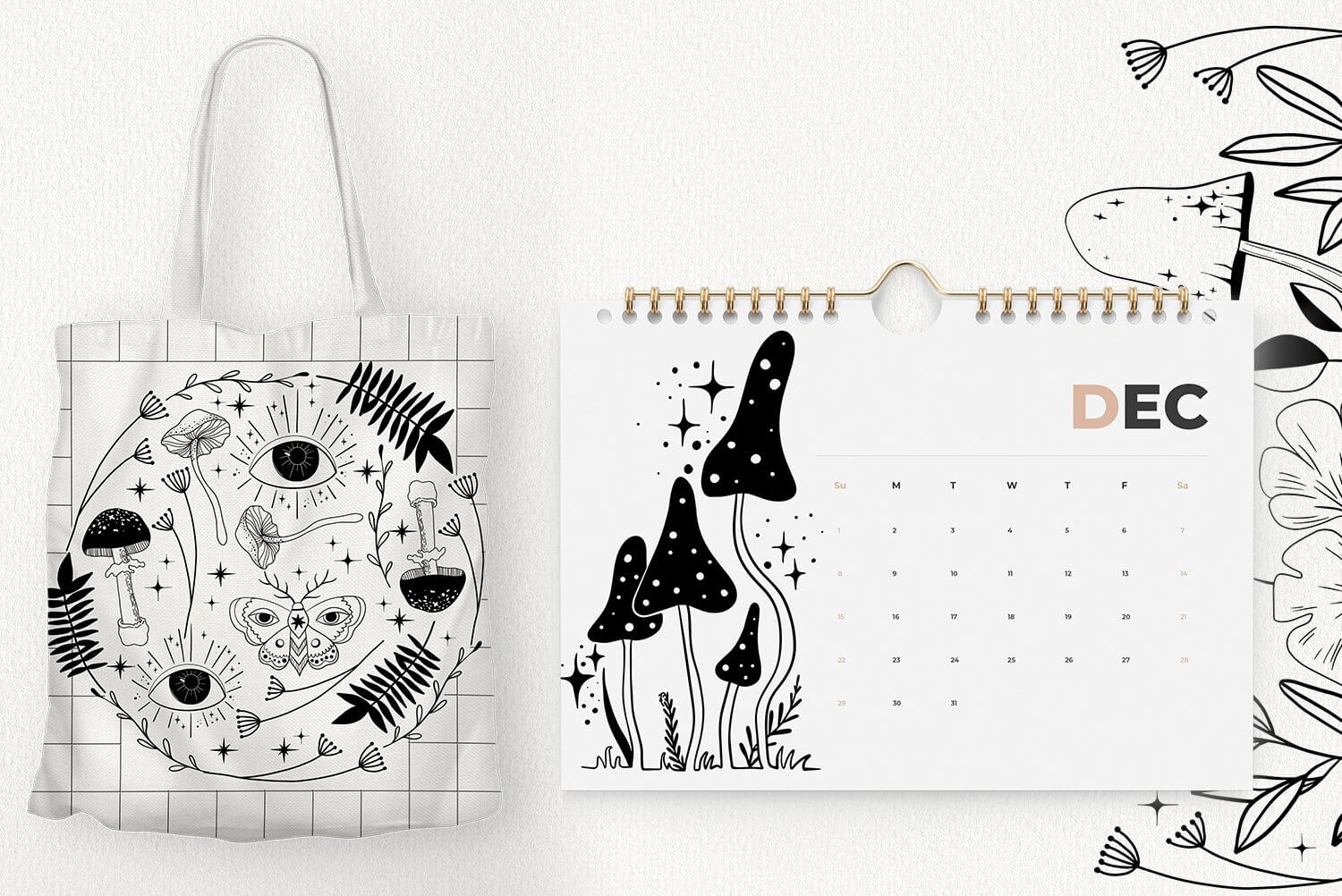 神秘和神秘物品、无缝图案、预制标志和插图的集合。以一条线的样式制作的简约对象。为您的产品、移动应用程序插图、社交媒体卡片、工艺商业产品、美容产品、服装和纺织品印刷等创建独特的简约风格。