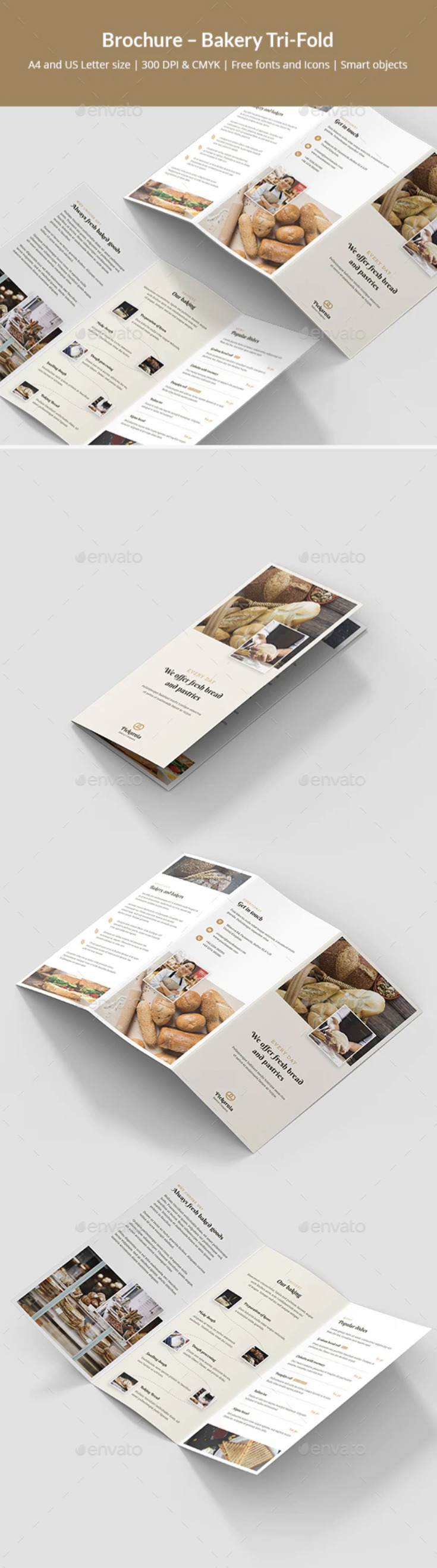这款三折页手册模板适用于许多企业。您可以将此模板用于:面包店、糖果店、餐厅、快餐店、菜单、食品菜单等。该模板是完全可编辑的。您可以使用不同的字体、颜色和背景。将您的照片放在模板中,并宣传您的企业。