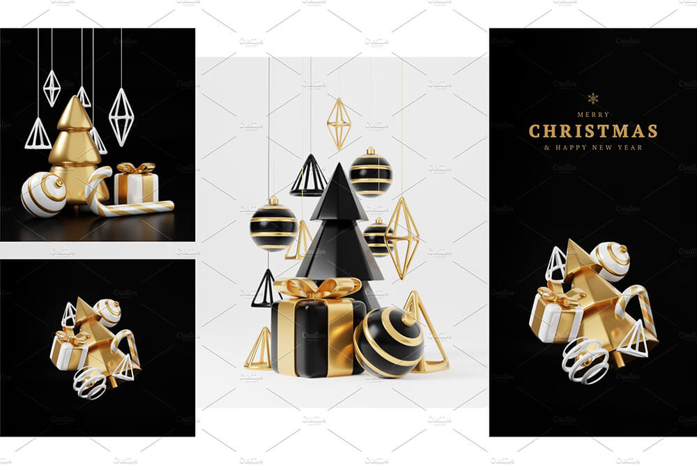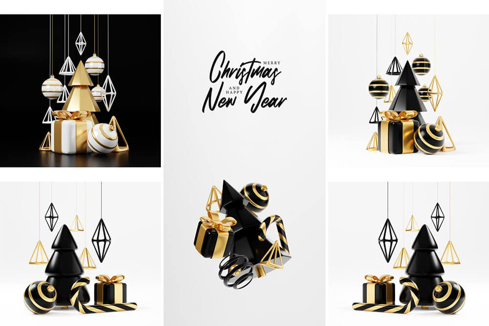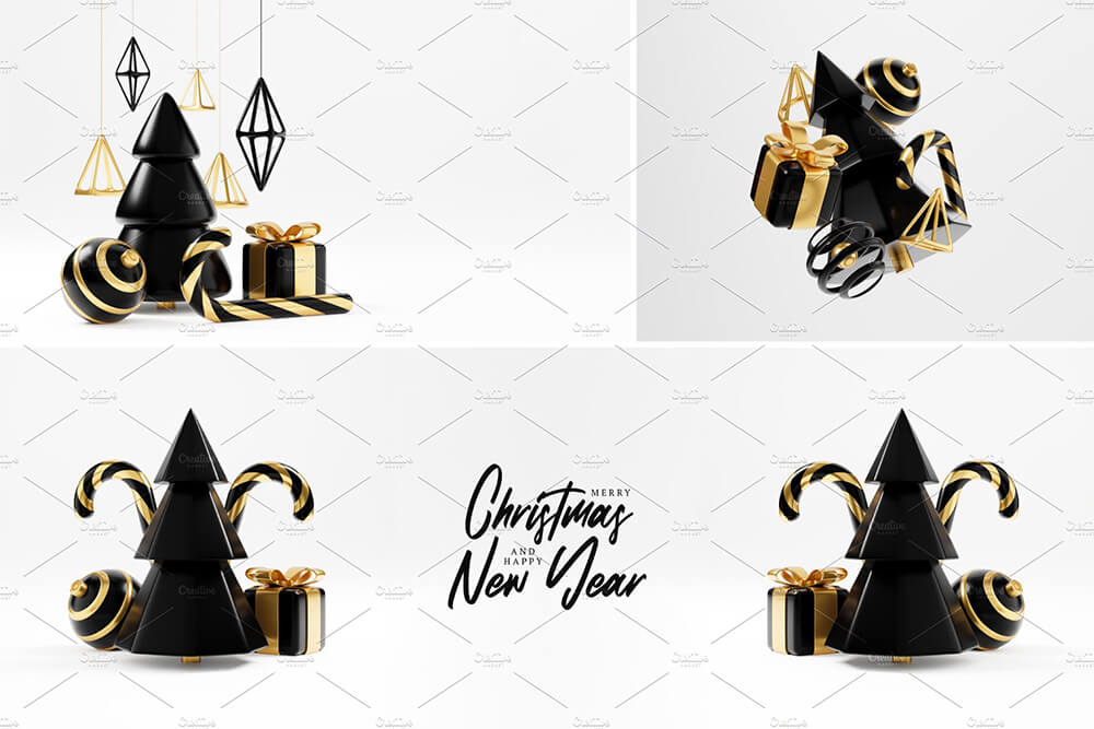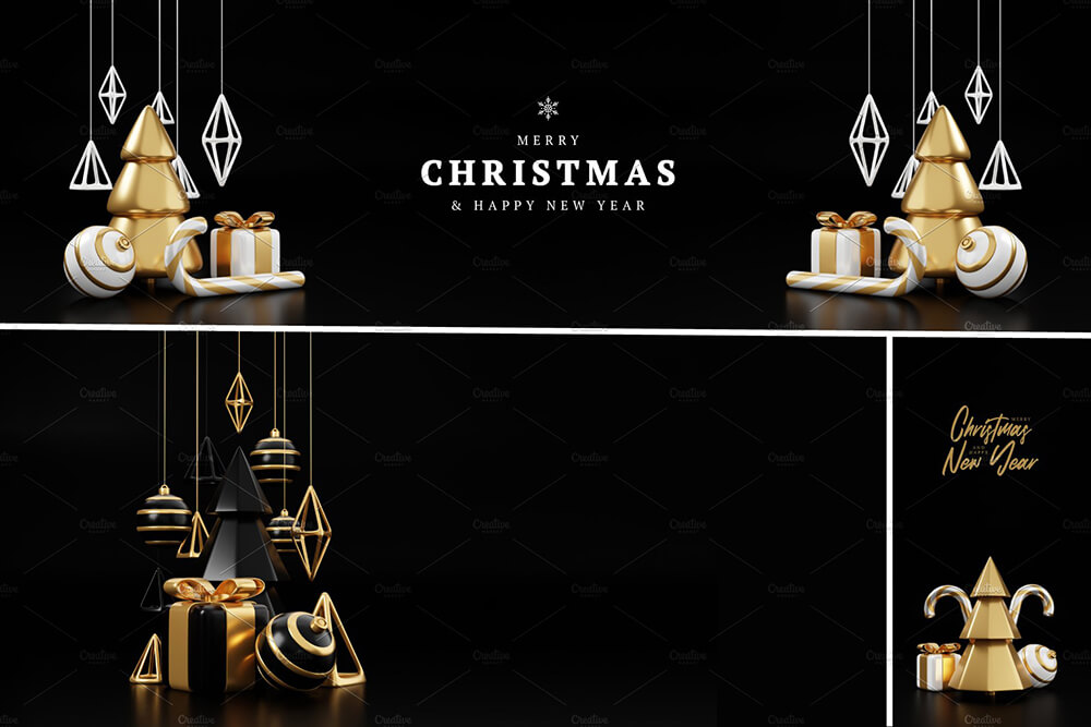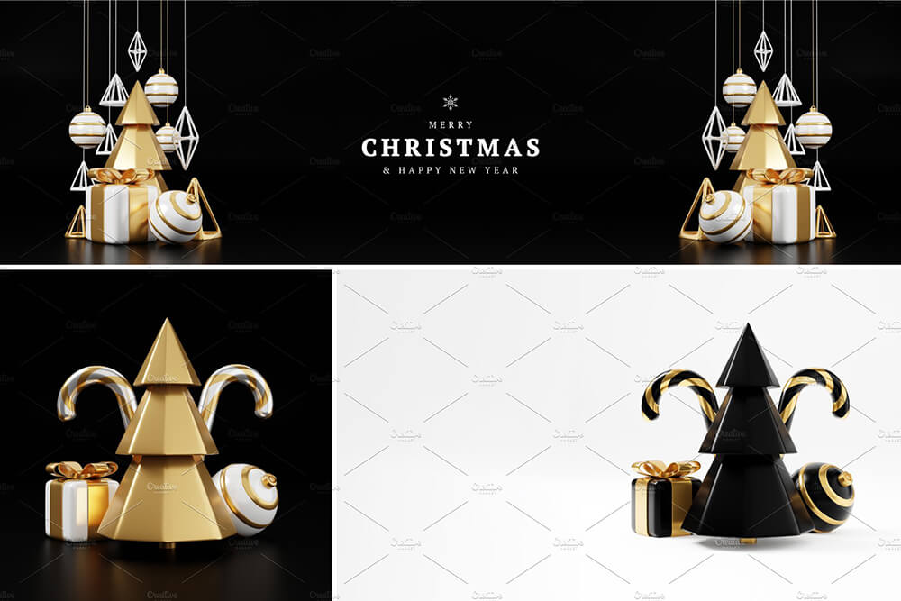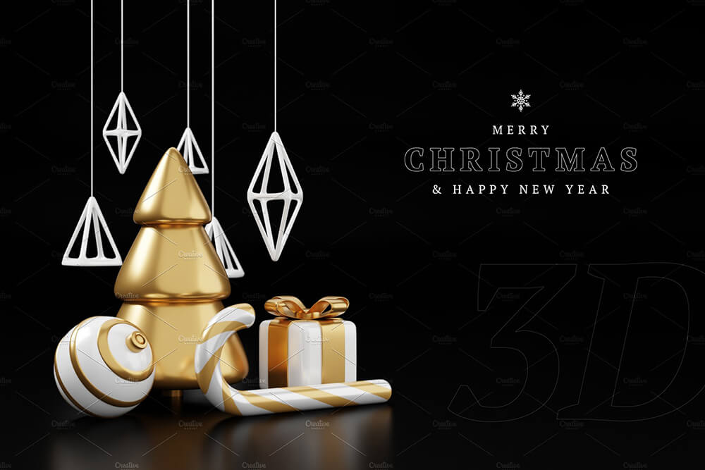 豪华圣诞D渲染横幅或贺卡。现代极简的新年和圣诞金色和黑色装饰,有树、糖果、球、黑色背景礼盒。