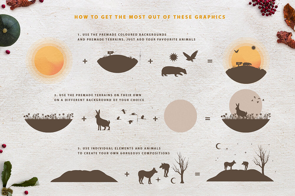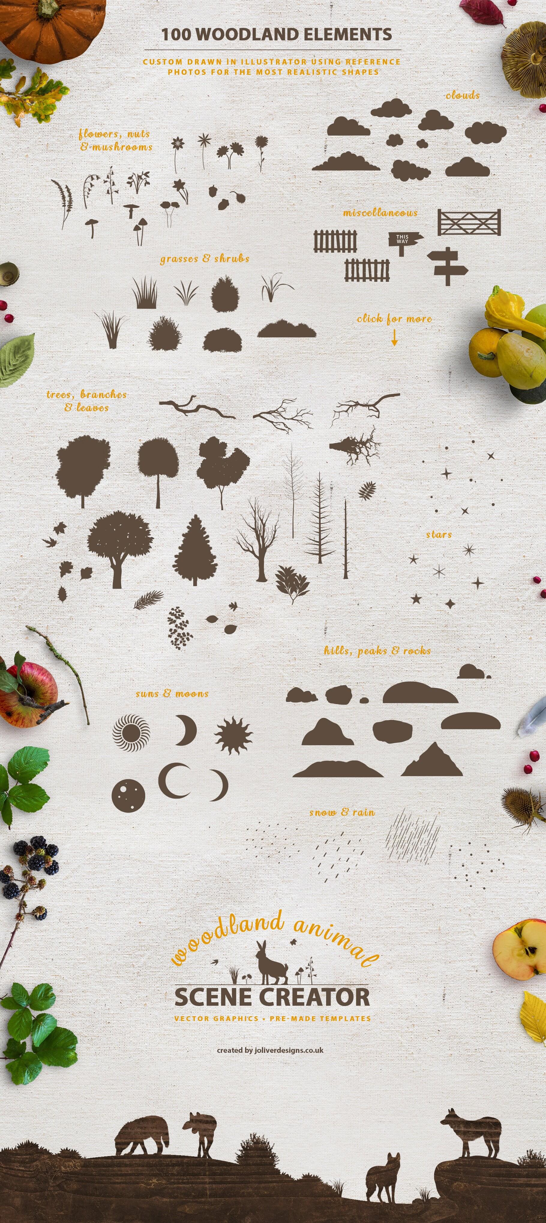 使用这些矢量轮廓元素和背景渐变创建您自己的令人惊叹的林地场景。使用您喜欢的任何组合,用动物、树木、花卉和天气构建神奇的自定义构图。非常适合制作贺卡和礼品标签、邀请函、婚礼文具、网站图形、社交媒体图形、墙纸、包装纸、产品包装、苗圃设计和家居装饰、服装等。这是一个极其通用的套装,具有无限的可能性和组合!
