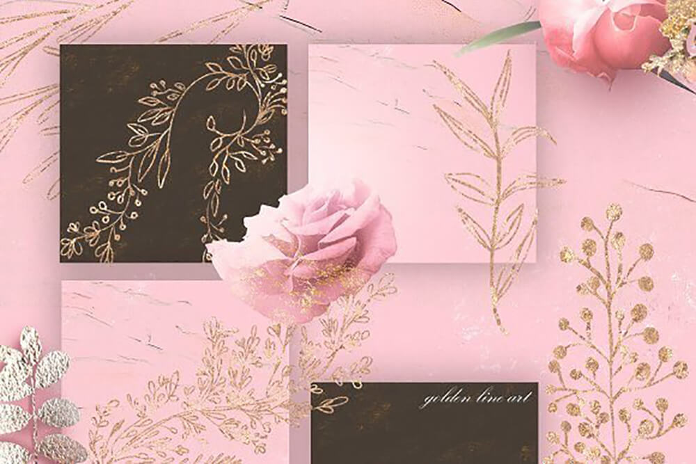 玫瑰金系列花卉剪贴画素材,带有淡淡金色的美丽花朵。鲜花、黄金、插花和花圈、金色线条艺术和背景。带有玫瑰金色调的美丽郁郁葱葱的花束非常适合您的设计项目,例如婚礼请柬、品牌设计、时尚项目等。该系列包含个人花卉元素、预制布置、花圈、手绘花卉线条艺术、闪亮的金色设计元素和美术背景。