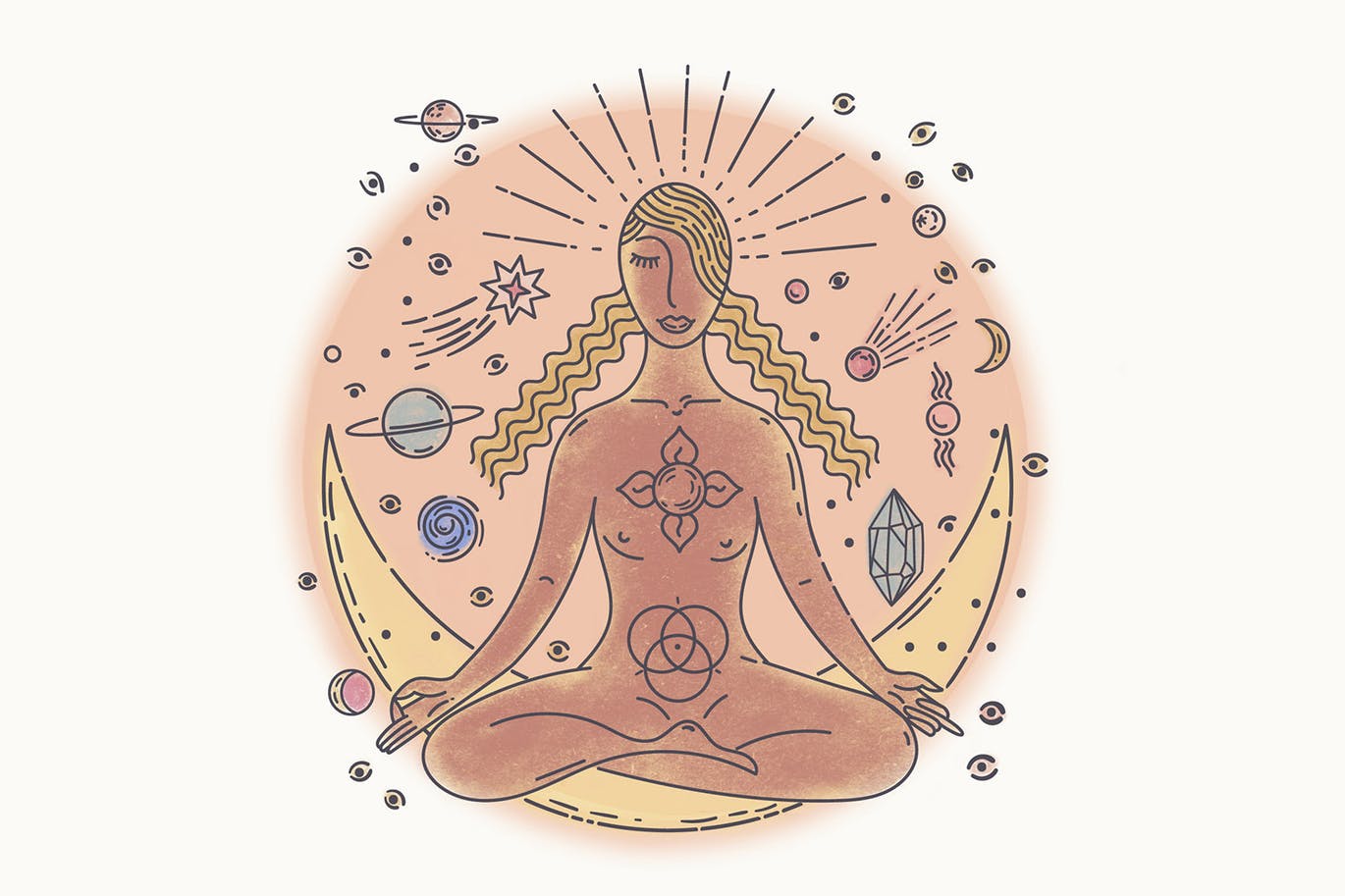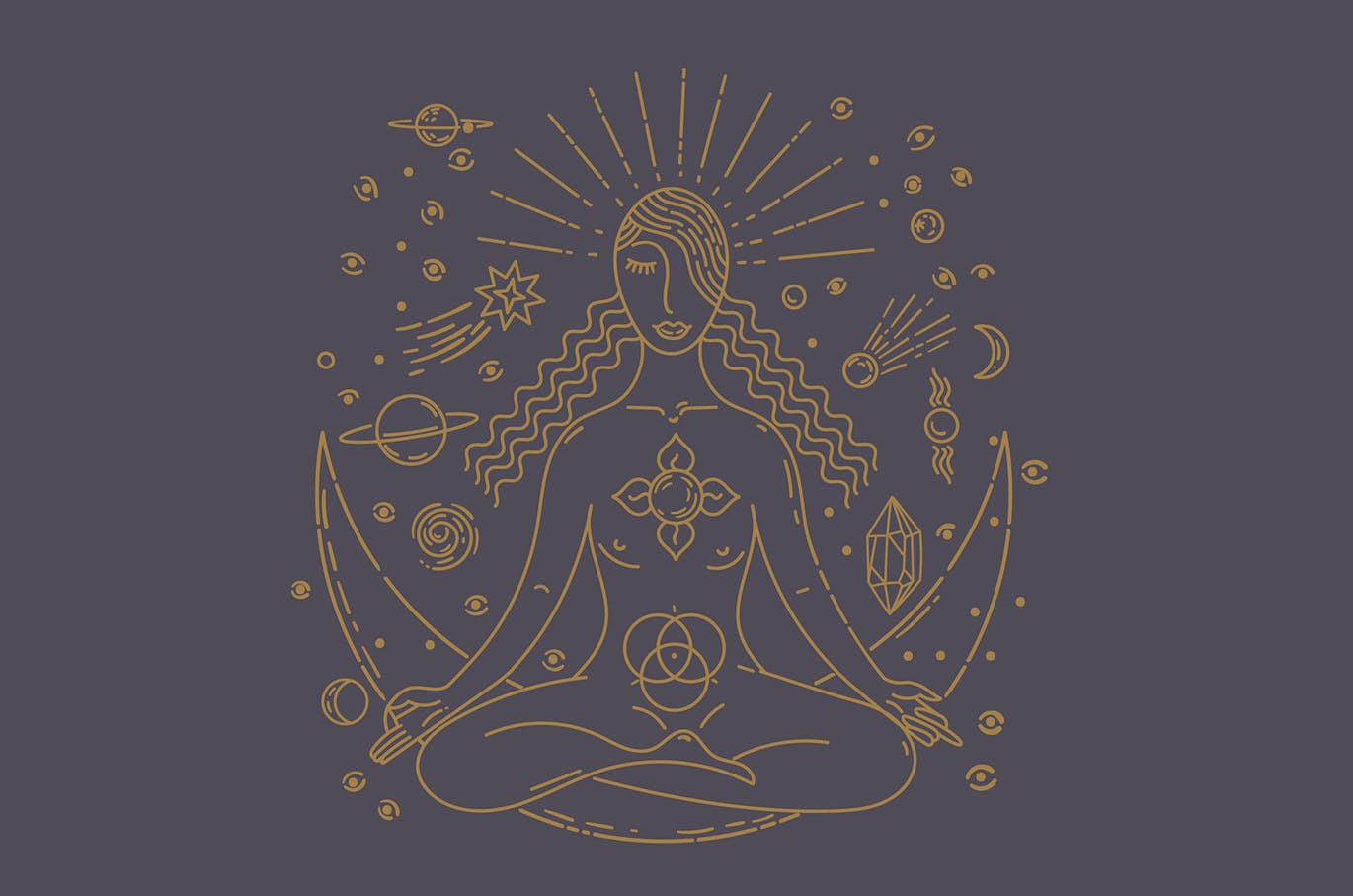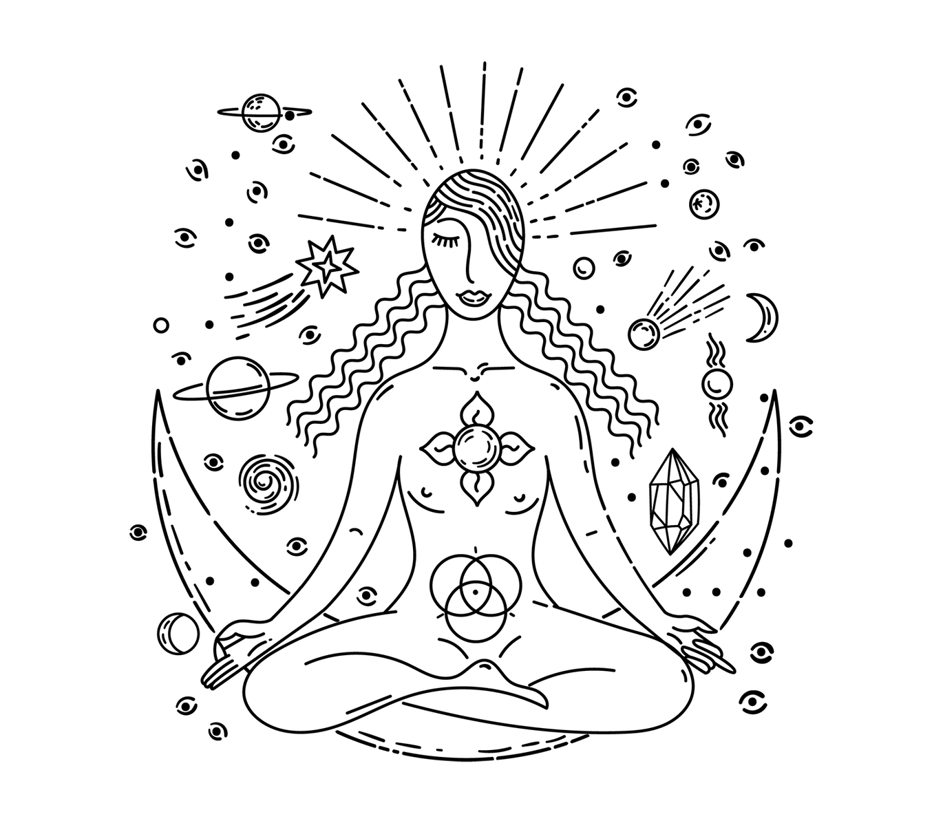 这次老不湿分享的是,瑜伽冥想姿势女孩矢量插画-AI, JPG, PNG,冥想姿势的女孩。非常平静祥和,魔法/神秘能量/星星环绕在她身边