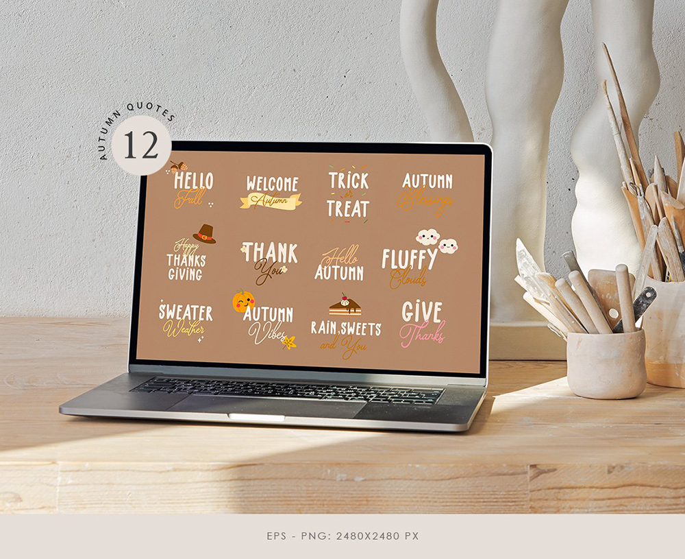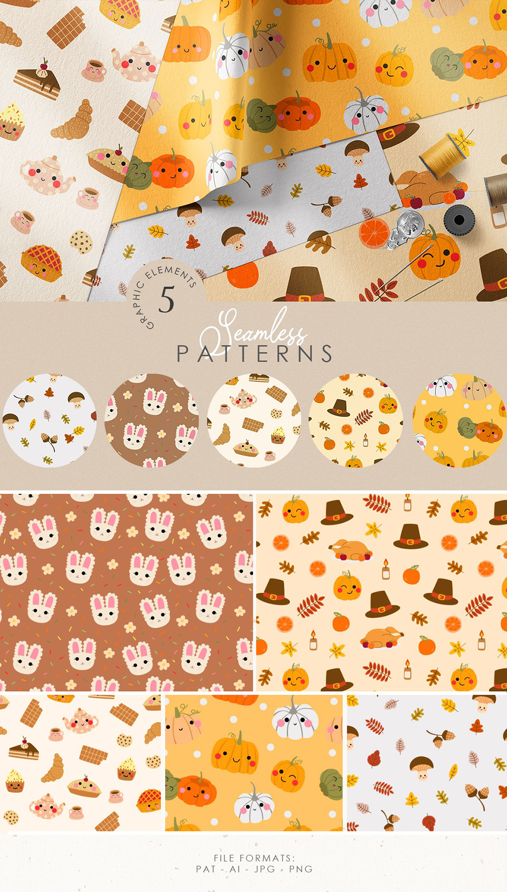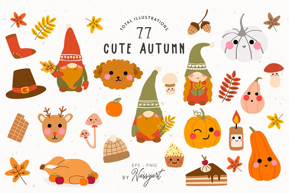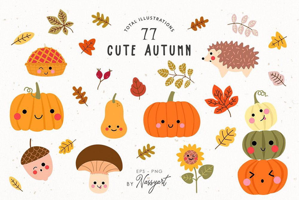 秋季卡哇伊舒适秋季套装- 一套可爱的秋季属性,如卡哇伊南瓜、蘑菇、刺猬、向日葵、秋季蛋糕、秋叶剪贴画、侏儒、针织帽、围巾、茶壶、杯子、有趣的动物面孔、感恩节装饰等等。在这个集合中,您会发现秋天的花环、秋天的明信片、可爱的卡哇伊秋天剪贴画、无缝图案和刻字。为您的朋友、家人制作带有秋天问候的自己的感恩节卡片。