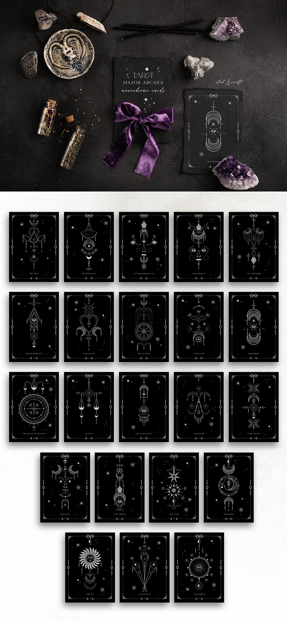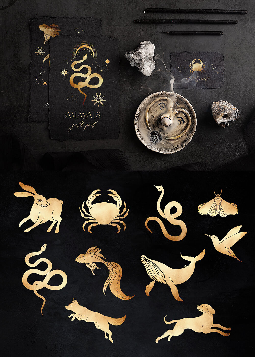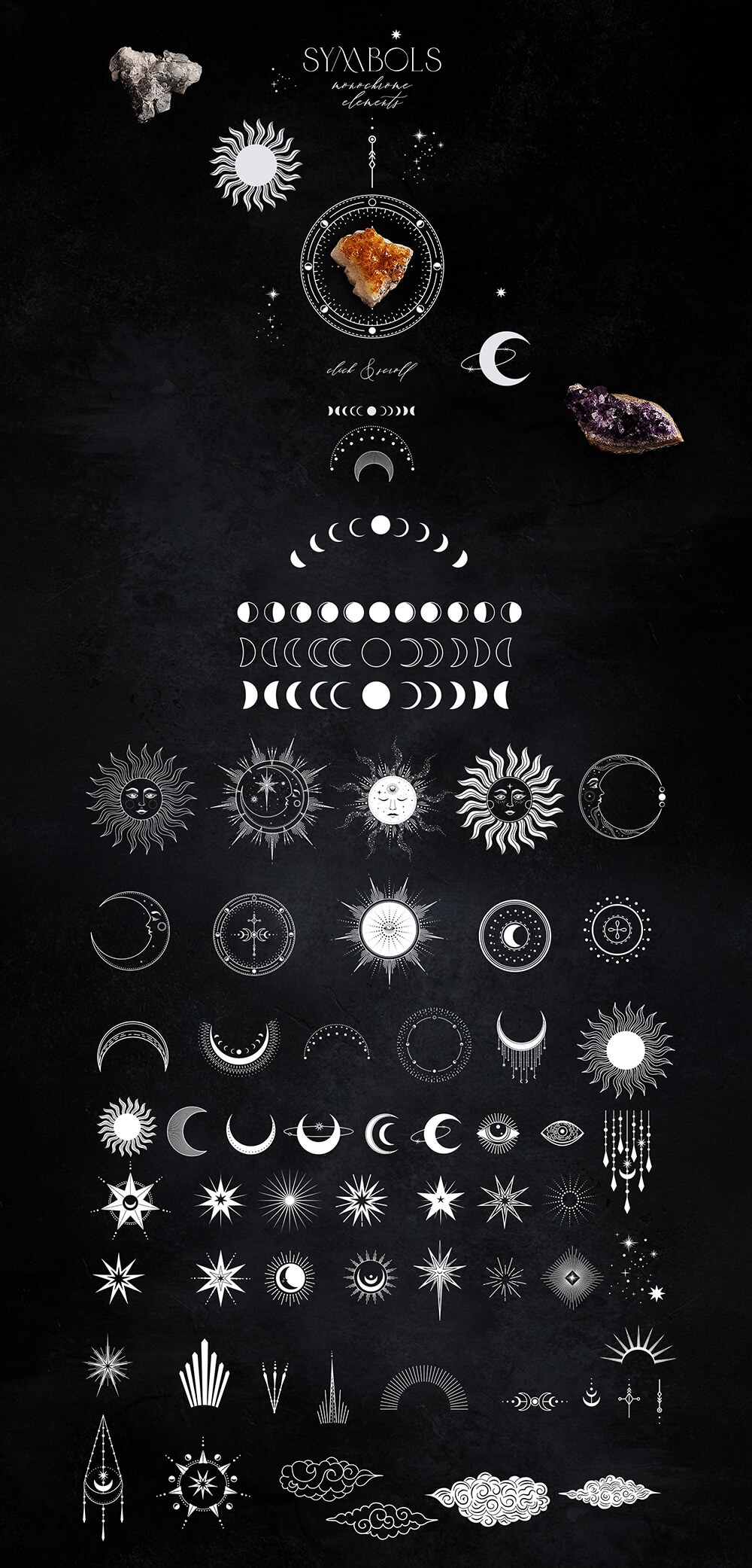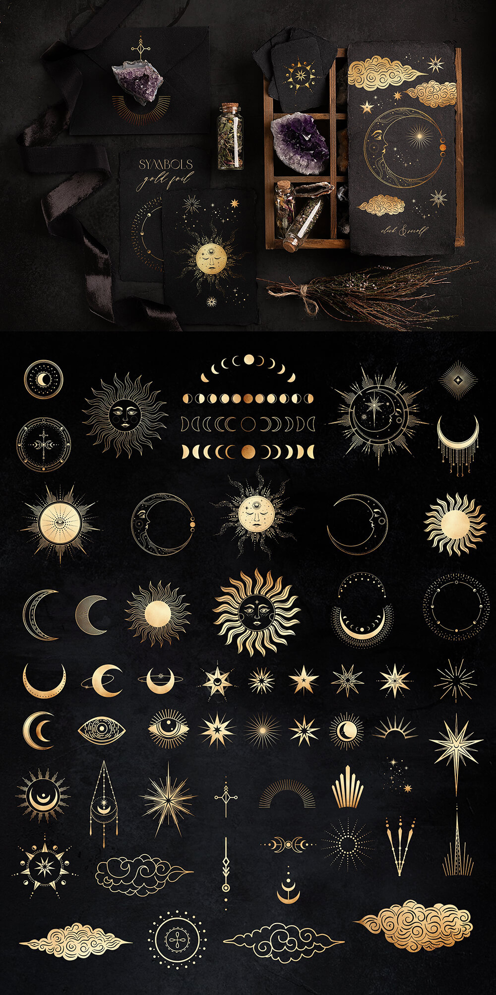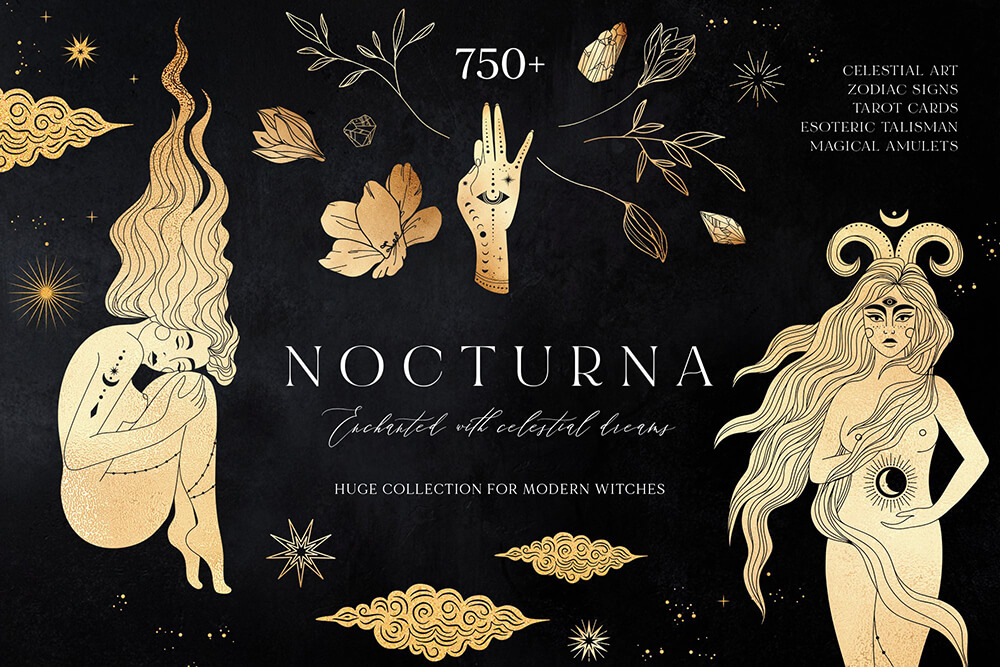 这是一个迷人的系列,其灵感来自温暖的月光、闪烁的星星的金色和太空的黑色肉体,隐藏着最神秘的秘密。包含 700+线条艺术图形元素,可让您唤醒自己的魔力并简化项目的工作过程。高质量的插画使您可以根据自己的想象力尽可能广泛地应用它们。这些神奇的宝物将装饰任何项目,无论您构想什么,并且在任何时候都具有相关性!