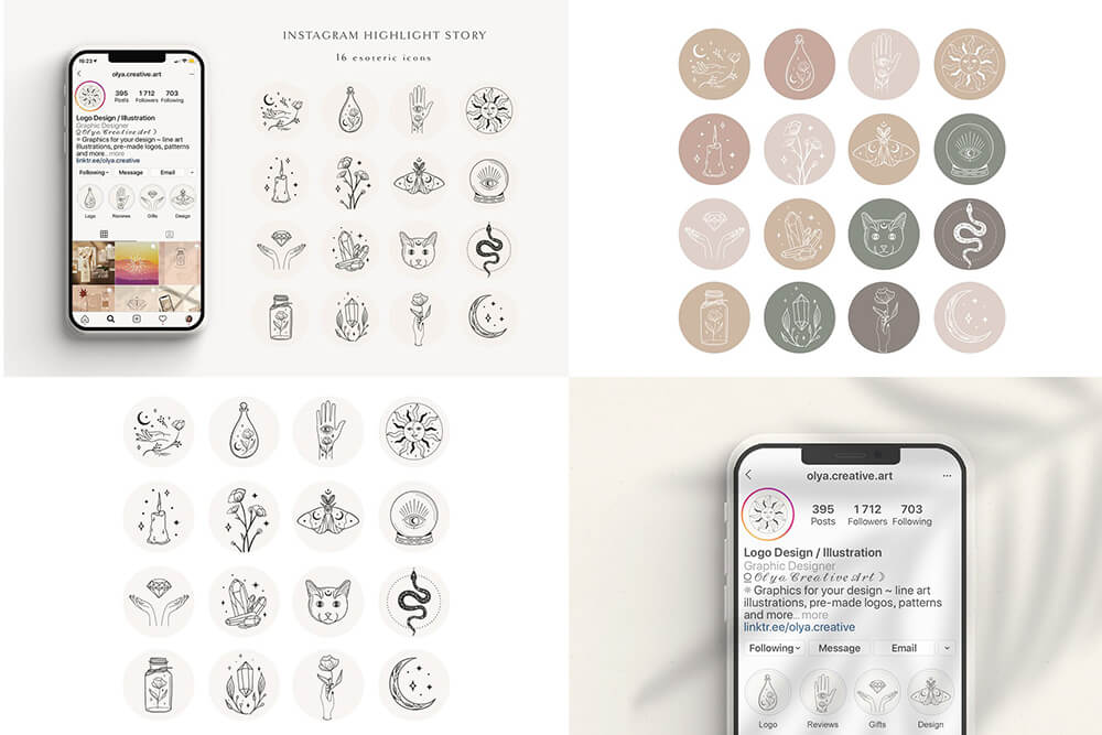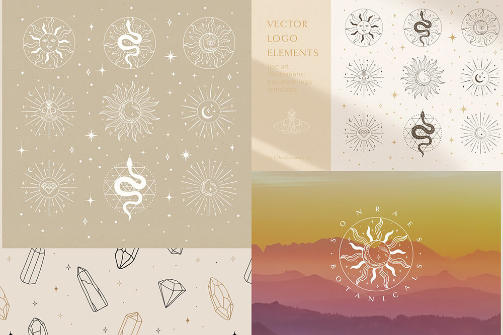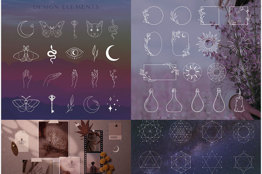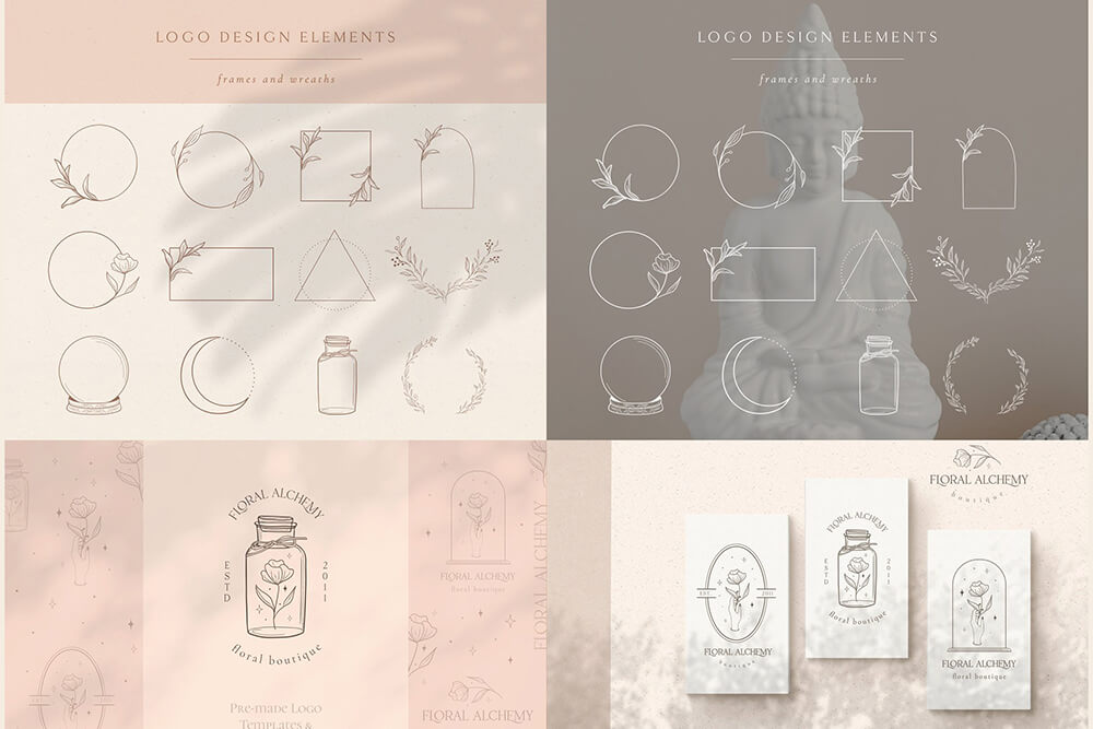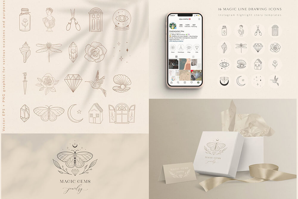 线条艺术图形元素 ~ 预制徽标和包装设计、徽标元素、插图、Instagram、显示图标和模板、无缝图案、几何和花卉框架等等!