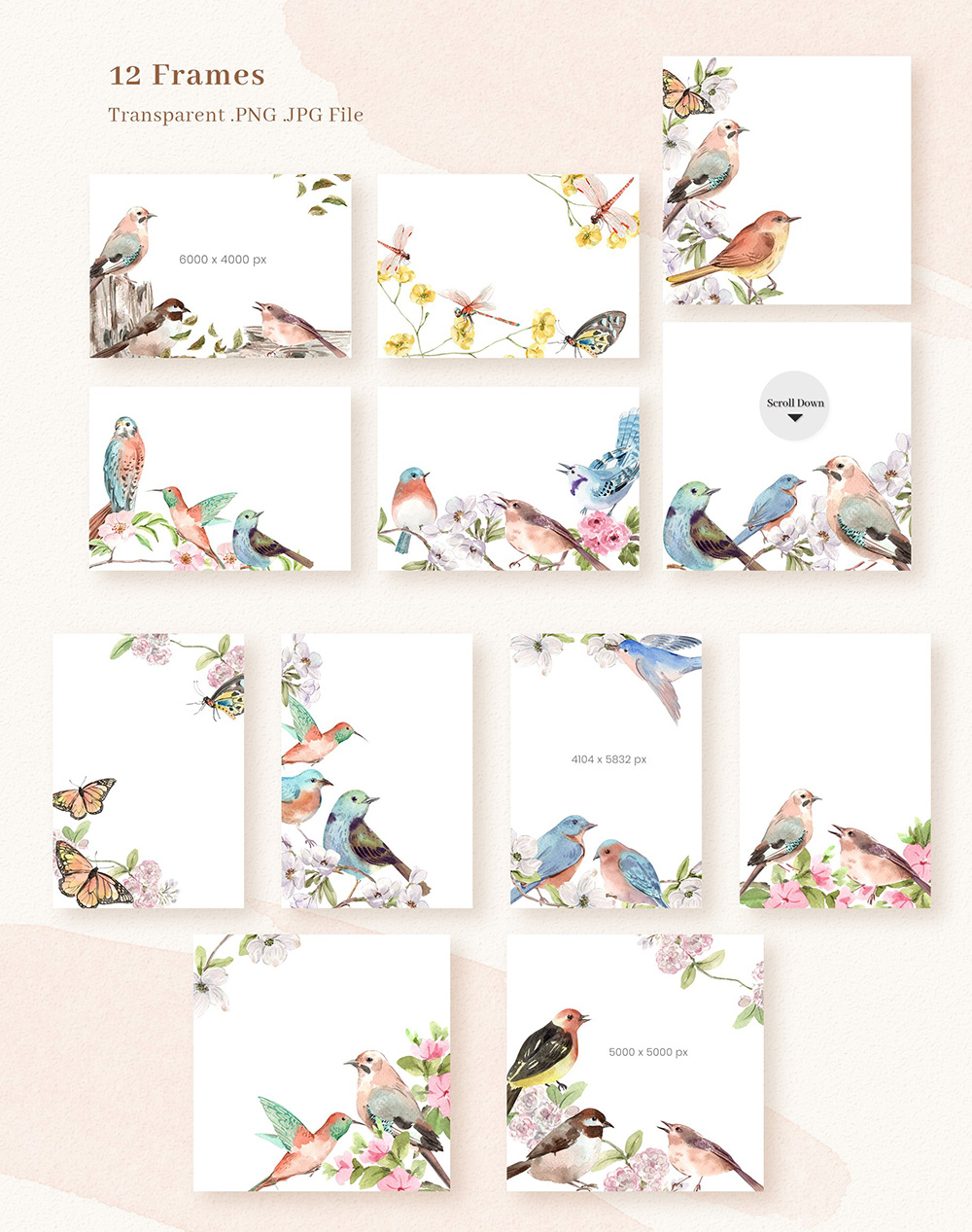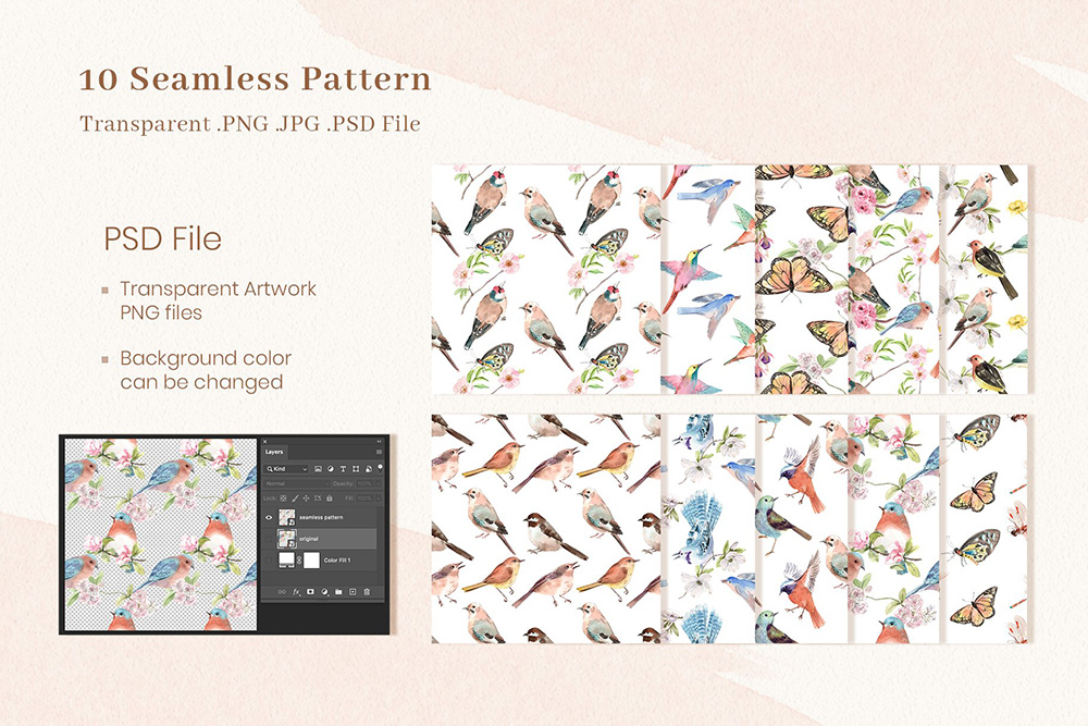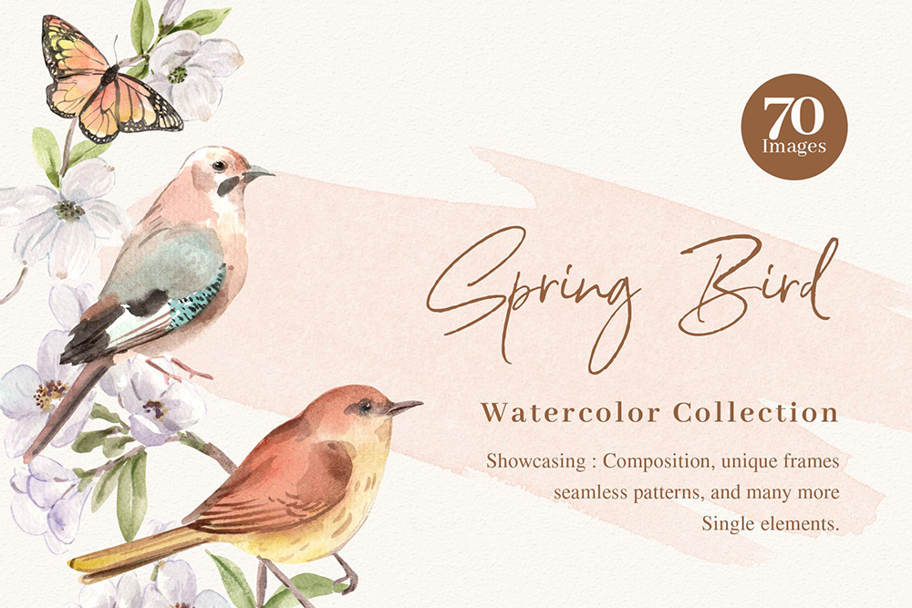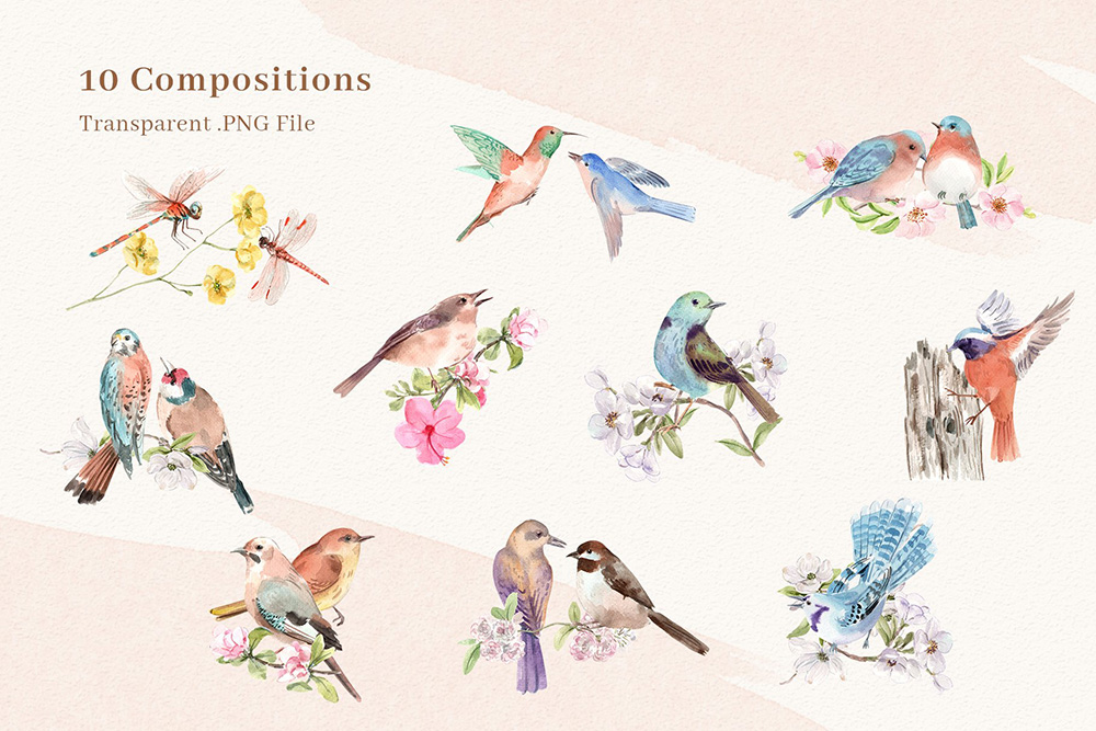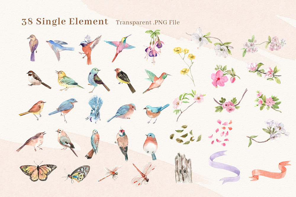 春鸟春天水彩剪贴画素材;为了获得最佳质量,所有元素均为高分辨率300 DPI所有PNG文件均具有透明背景。感谢您对水彩奇观的热爱。我们希望您喜欢我们的设计。