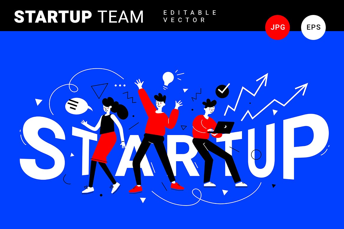 这次老不湿分享的是,时尚高端扁平化风格创业团队矢量插画设计模板,年轻愉快的人队的创造性的企业例证有词起动,膝上型计算机和太空飞船的在颜色背景。小组的通信商人和妇女。团队合作人的平面卡通风格设计与火箭的web横幅,海报。