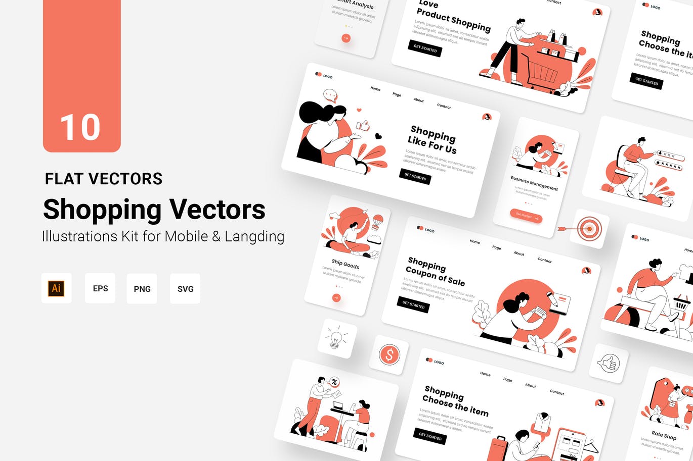 这次老不湿分享的是,时尚高端多用途的高品质矢量购物banner海报着陆页UI插画设计模板集合-AI,EPS,PNG,SVG,针对Web和移动设计的10个独特线条插图,可帮助您创建精美的设计。
