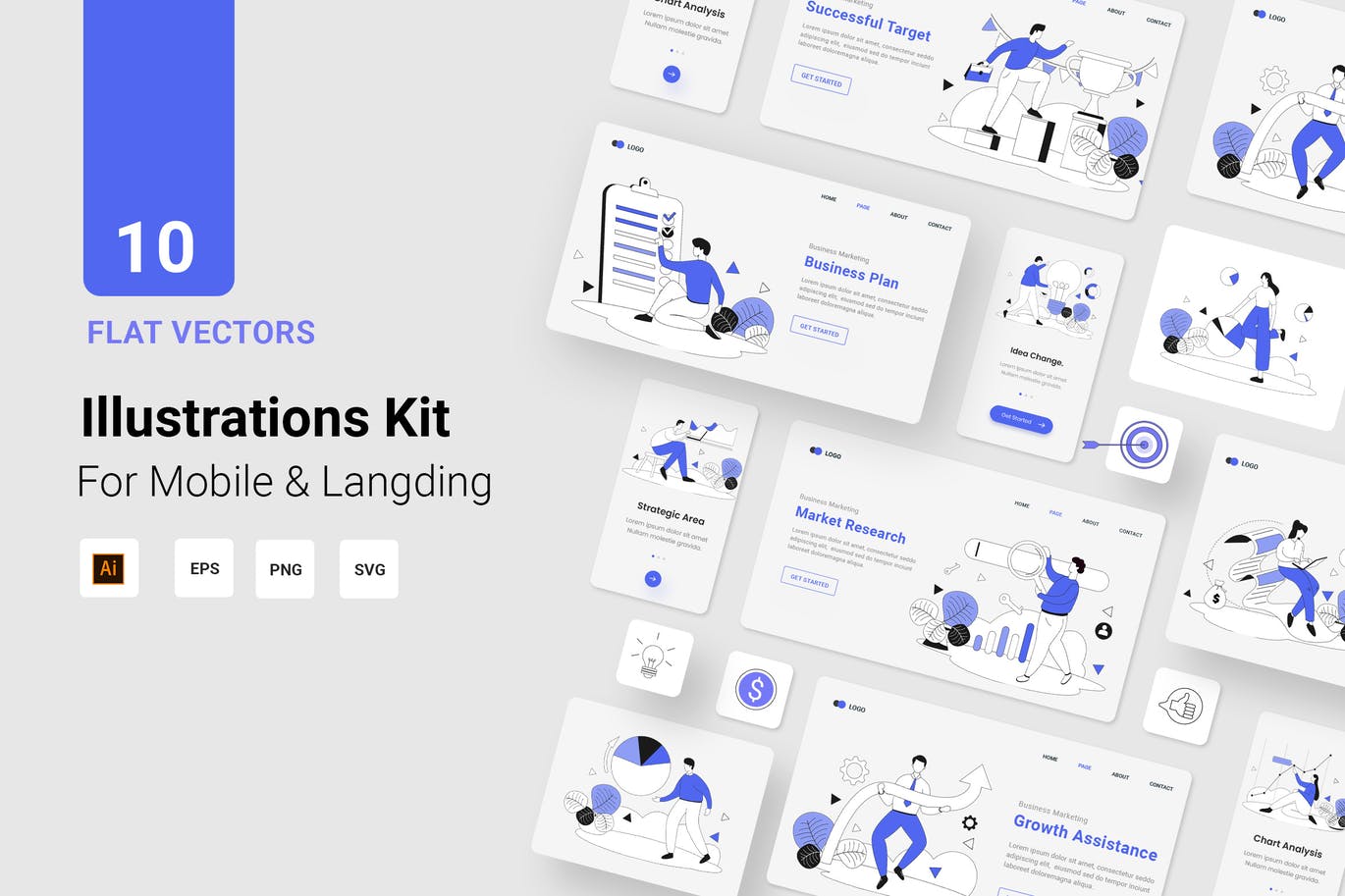 这次老不湿分享的是,时尚高端简约优雅扁平化风格业务插图矢量UI 插画着陆页设计模板-AI,EPS,PNG,SVG,针对Web和移动设计的10个独特线条插图,可帮助您创建精美的设计。