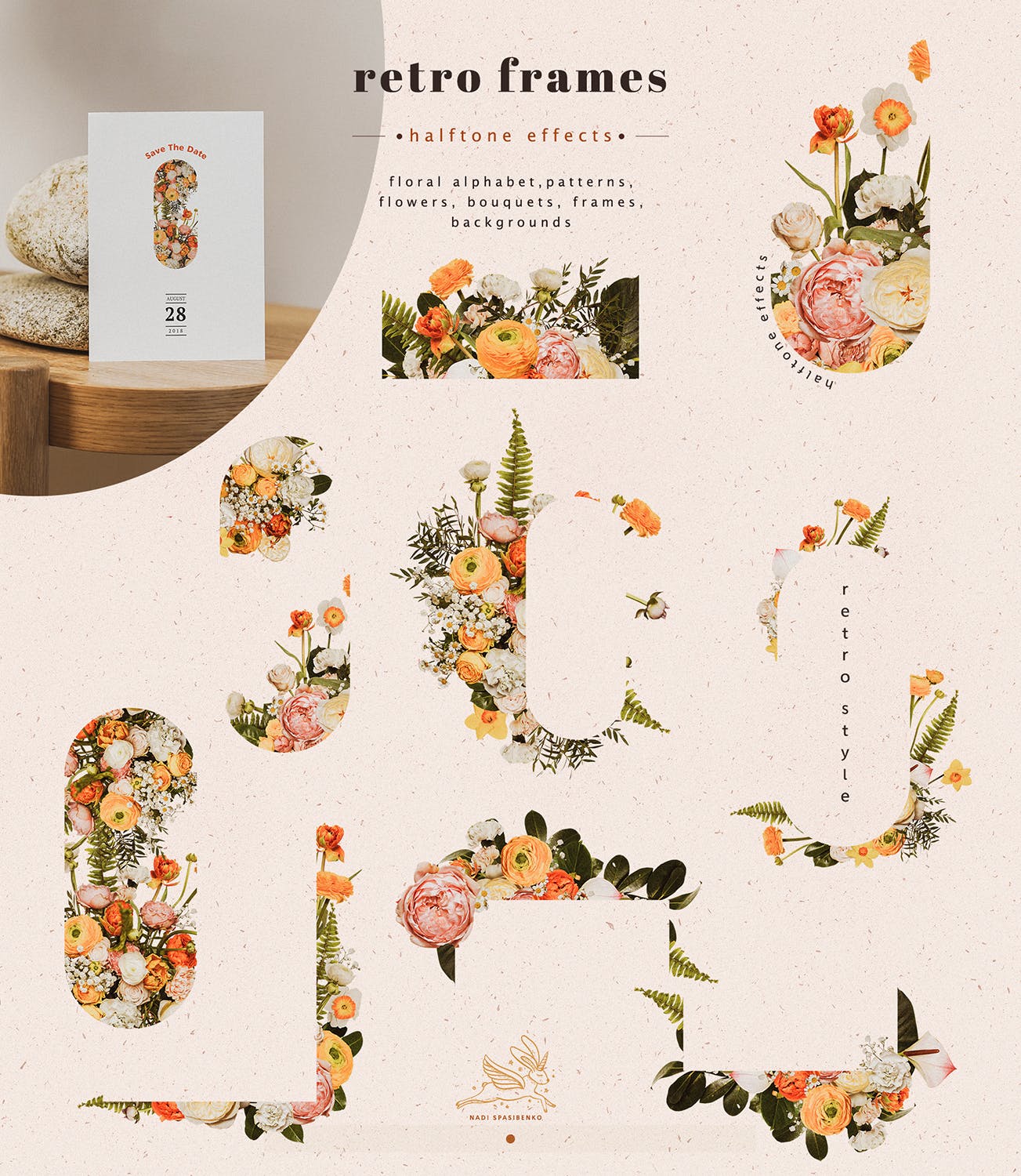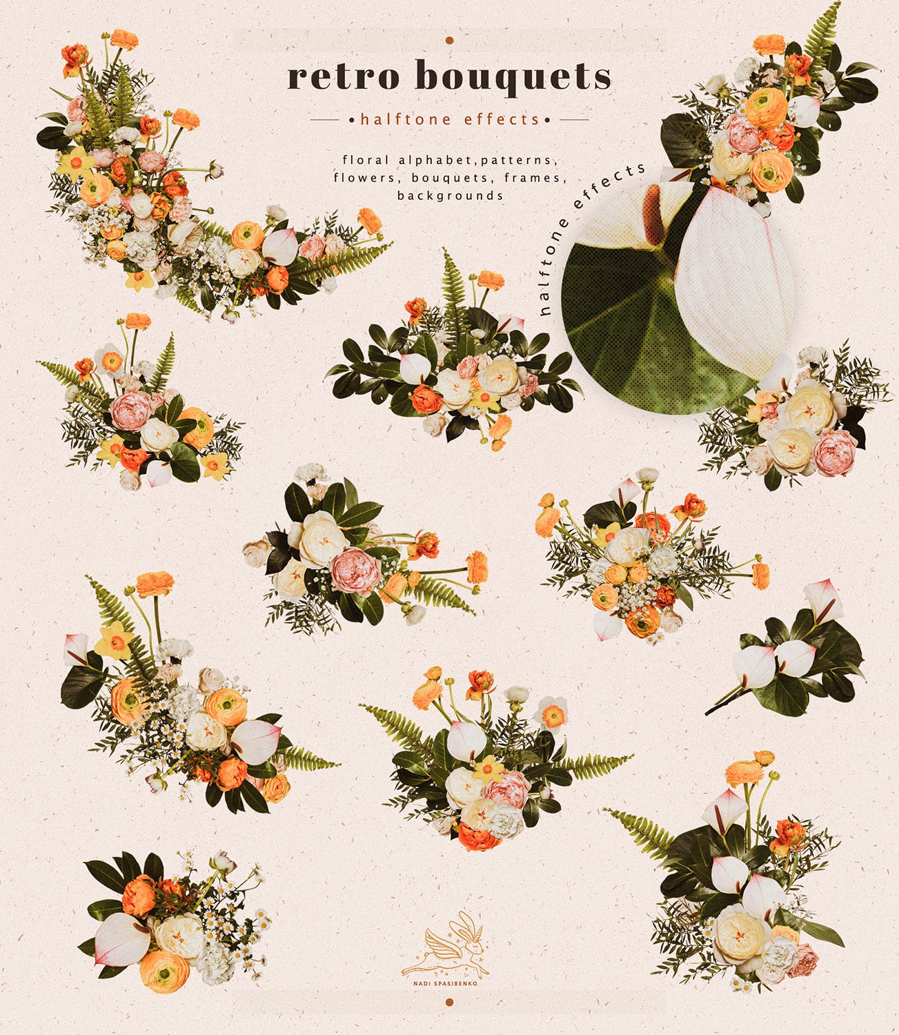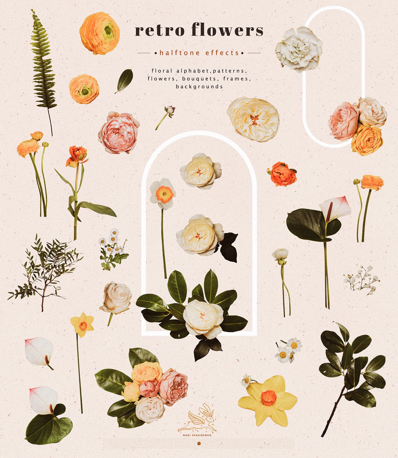 柔和的复古色调具有Halfton效果的6个复古渐变色。尺寸4000 x 6000像素5种花卉图案,尺寸5000 x 5000像素,带有黑色粗体字母的花卉字母28花束9框架和边框33花朵和树枝(康乃馨,玫瑰,水仙花,马蹄莲,毛ran,蕨类,洋甘菊等)