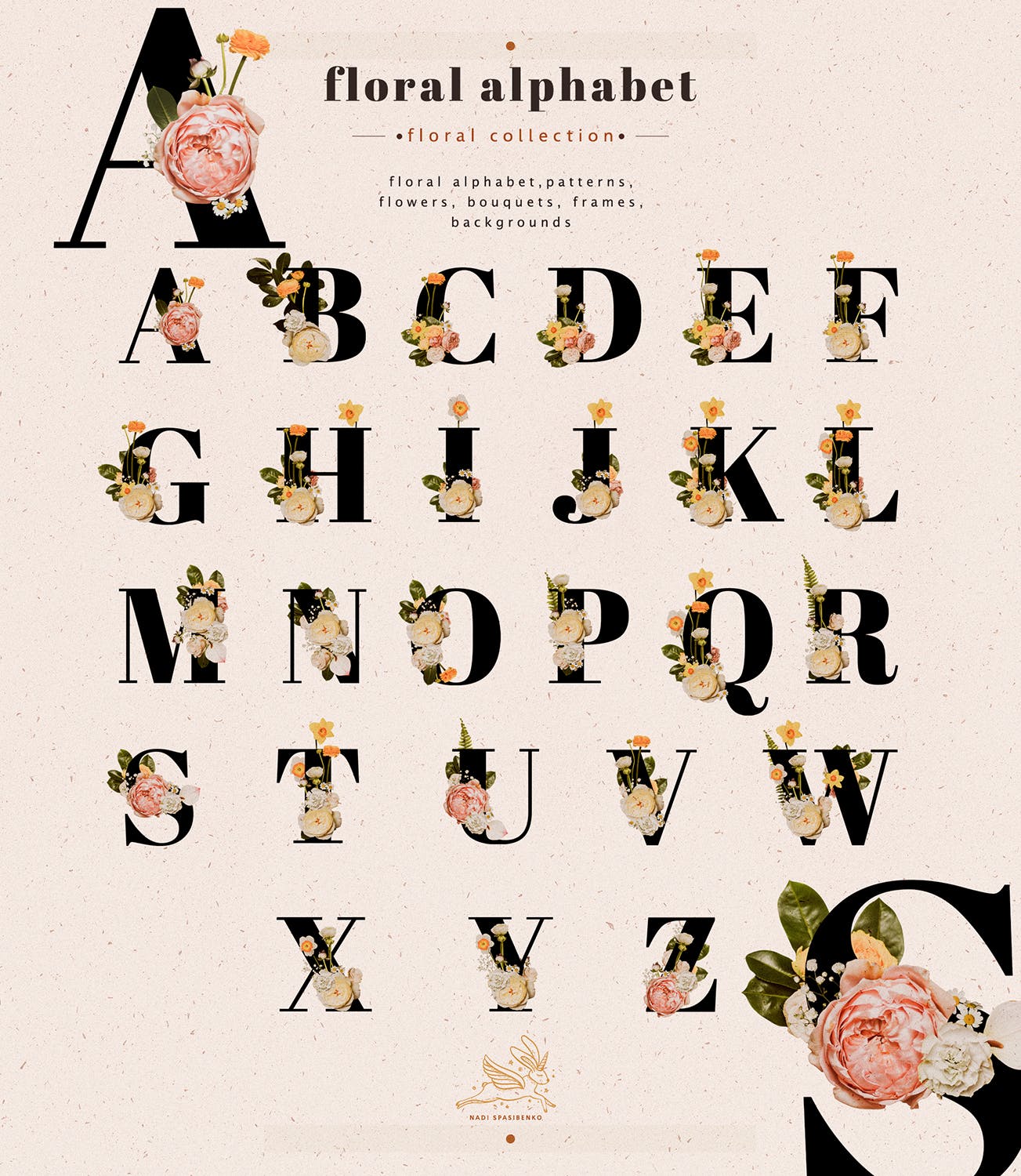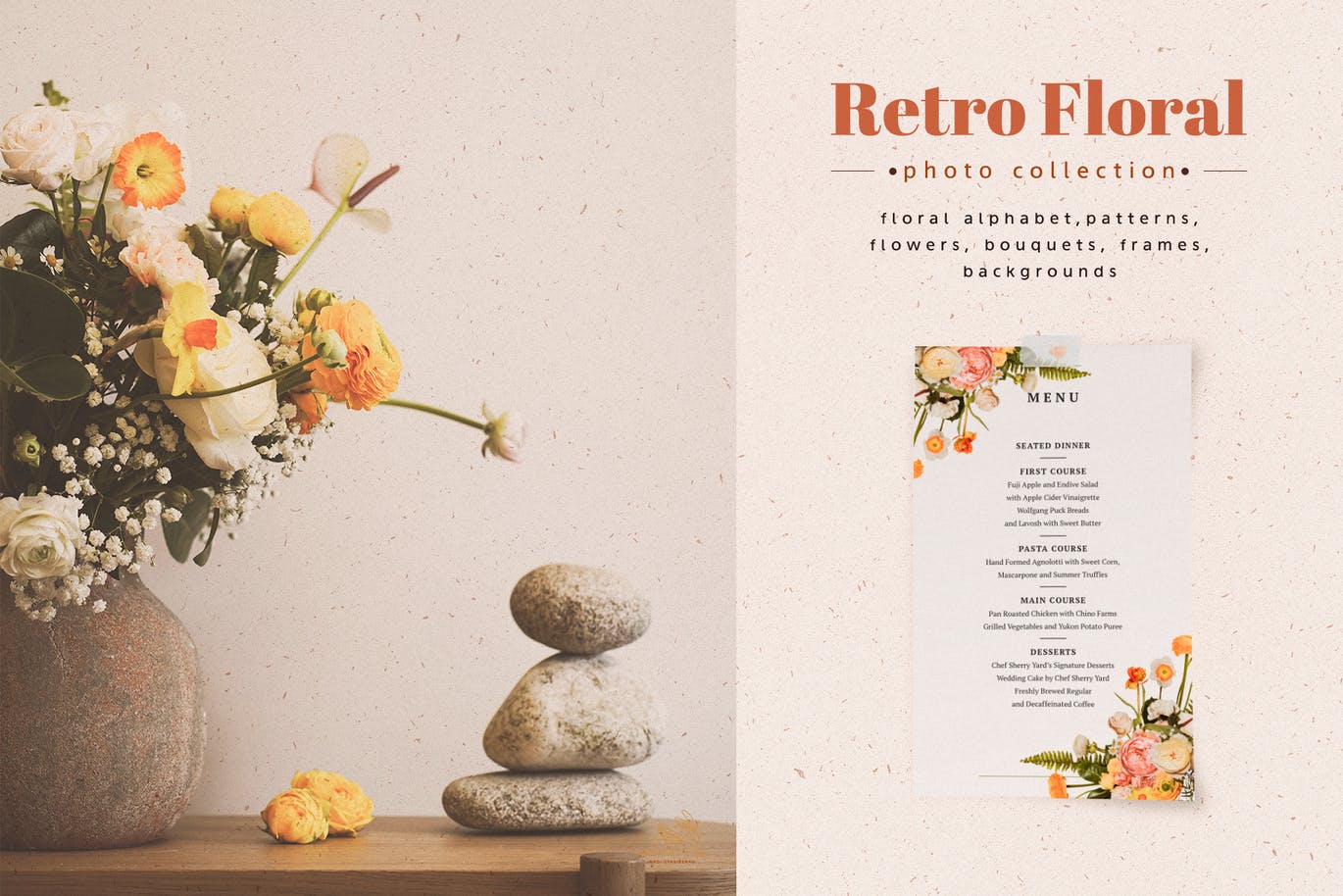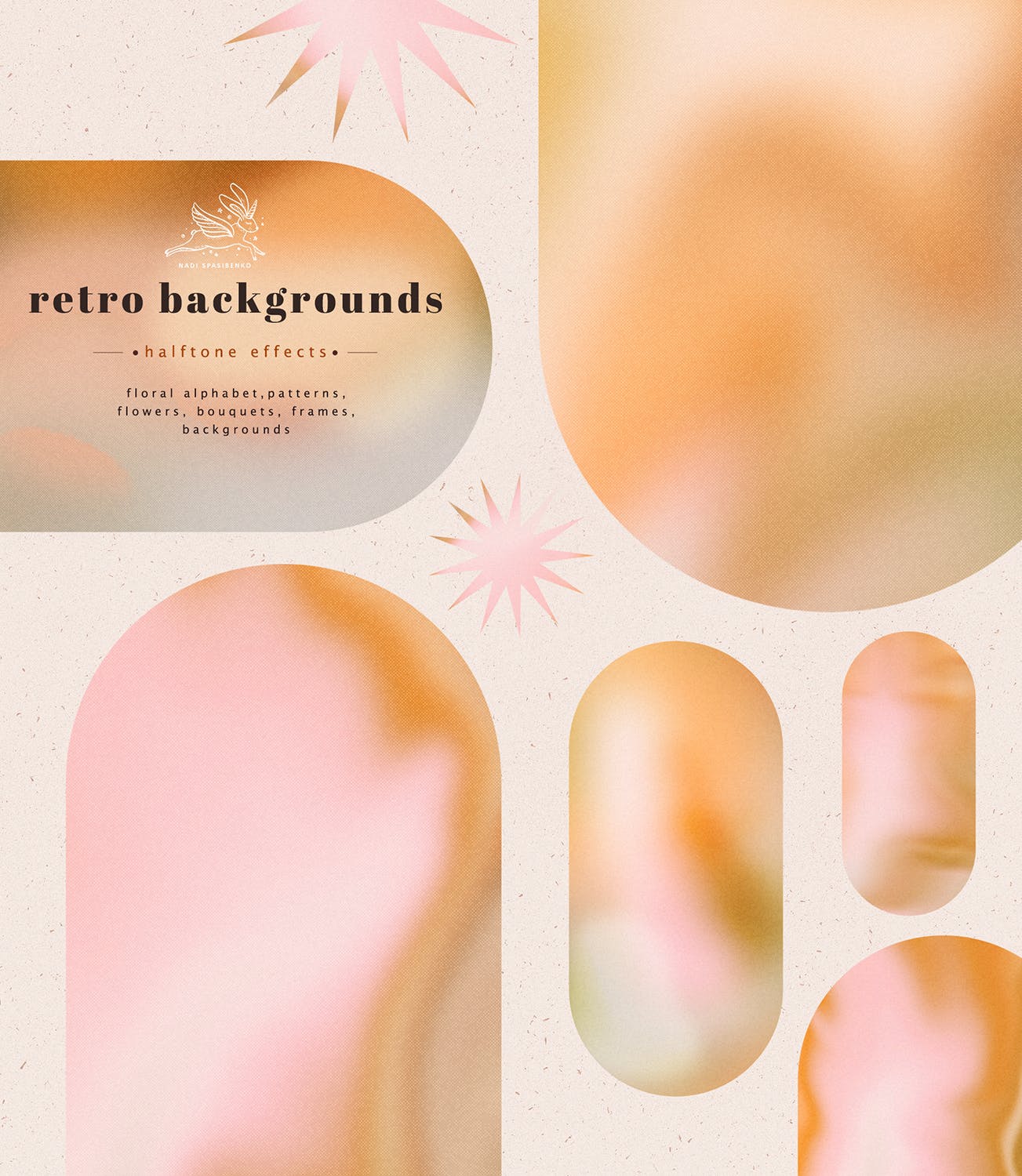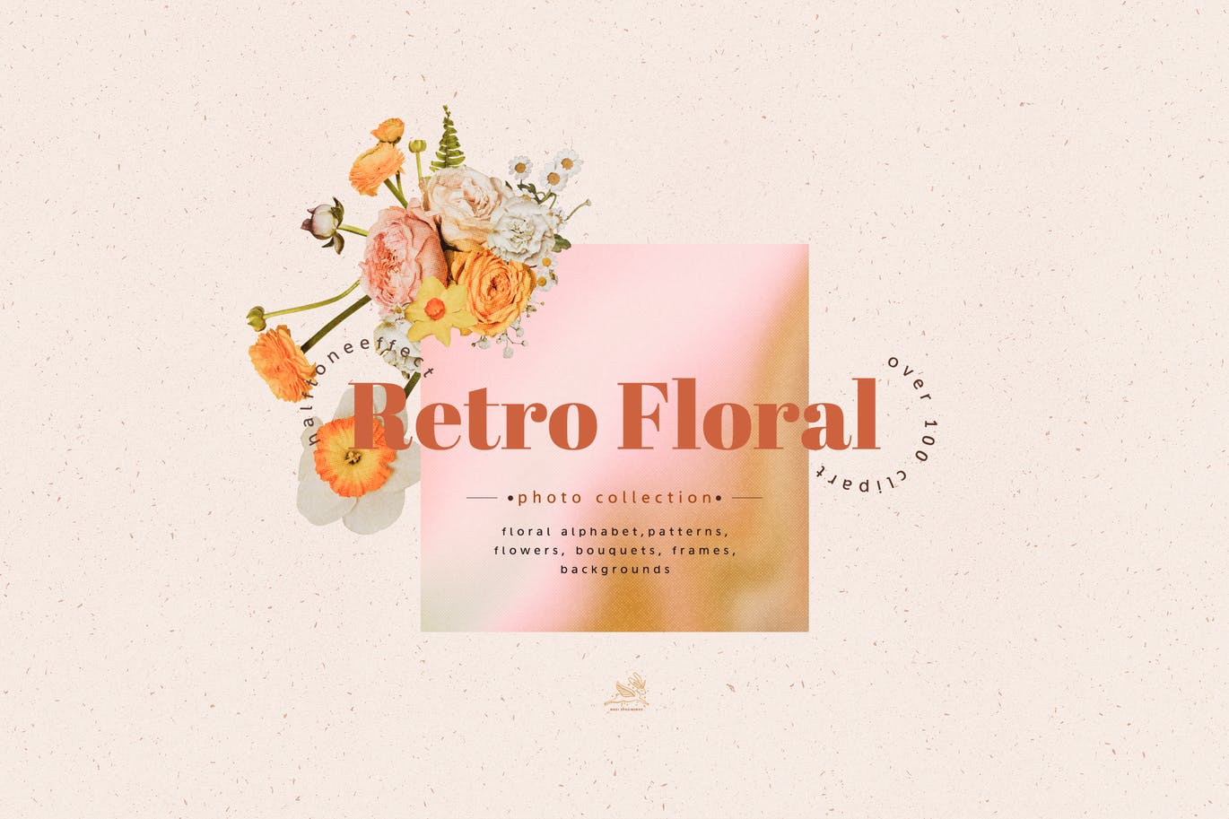 柔和的复古色调具有Halfton效果的6个复古渐变色。尺寸4000 x 6000像素5种花卉图案,尺寸5000 x 5000像素,带有黑色粗体字母的花卉字母28花束9框架和边框33花朵和树枝(康乃馨,玫瑰,水仙花,马蹄莲,毛ran,蕨类,洋甘菊等)