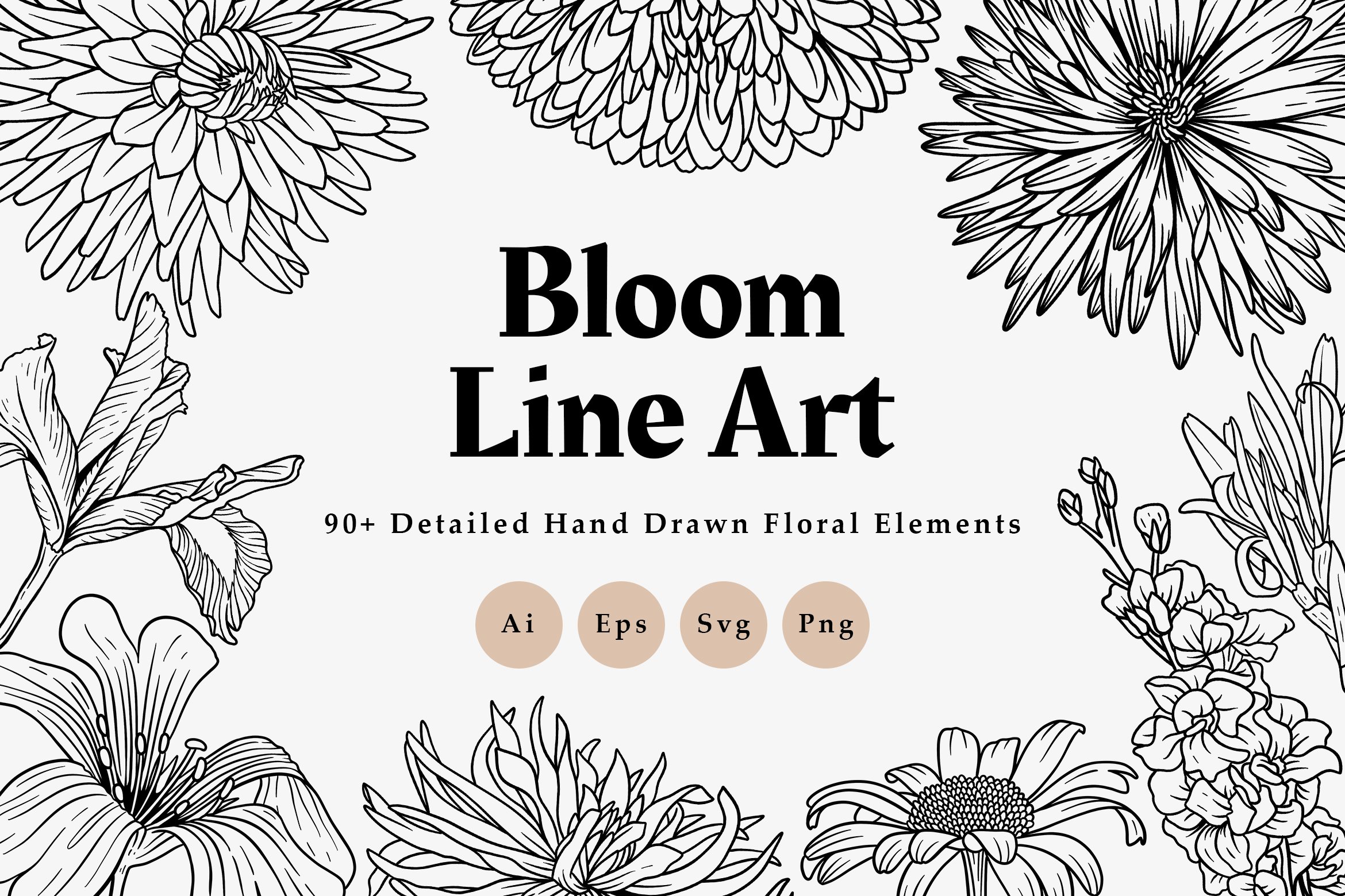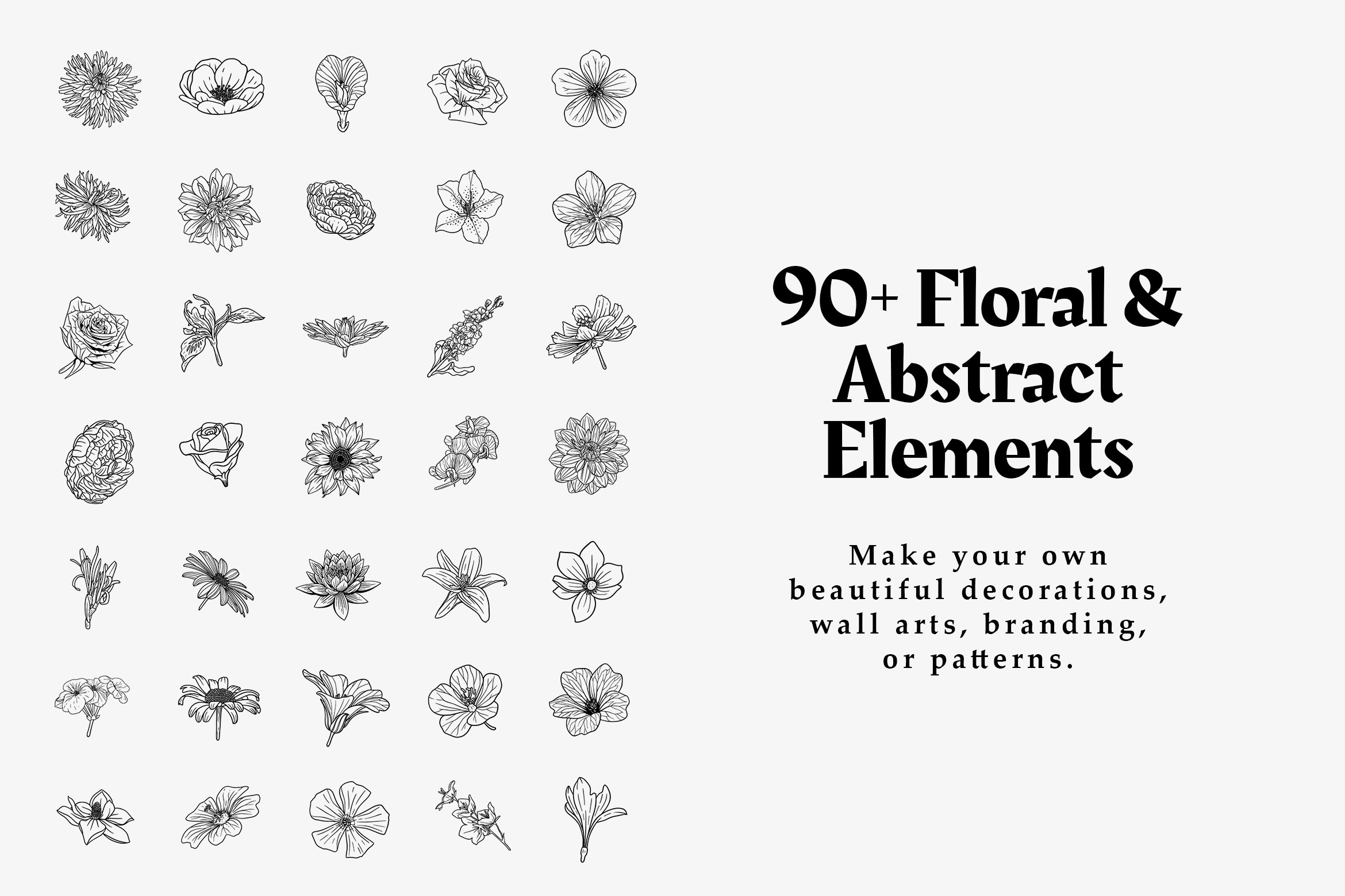 90多种详细的手绘花卉线条艺术元素,手工绘制,并通过线条添加细节以使其看起来更真实。适用于装饰,墙壁装饰,图案或您的公司品牌。配备了大尺寸的矢量文件和png文件。可以与线条艺术相结合的抽象元素,从而产生精美的艺术品。制作自己美丽的装饰品,墙壁艺术,品牌或图案。