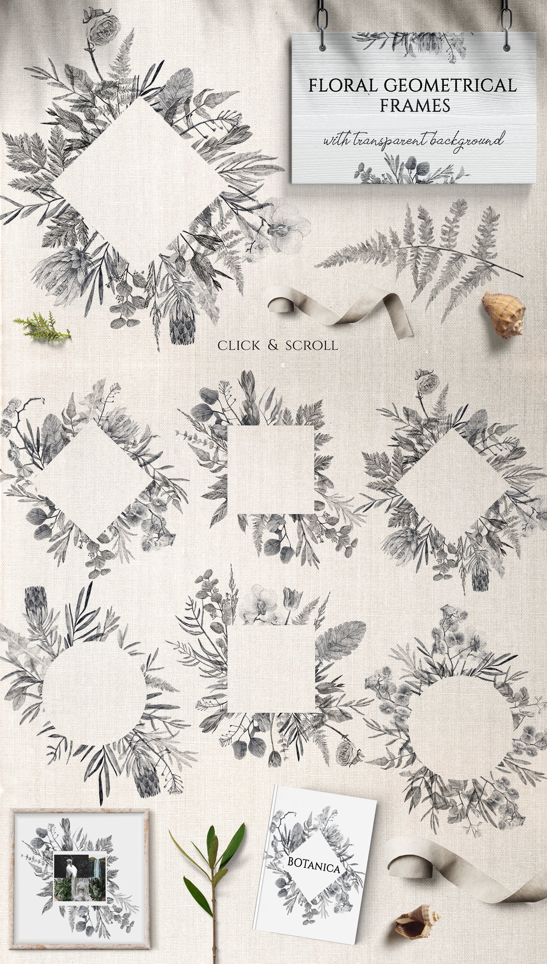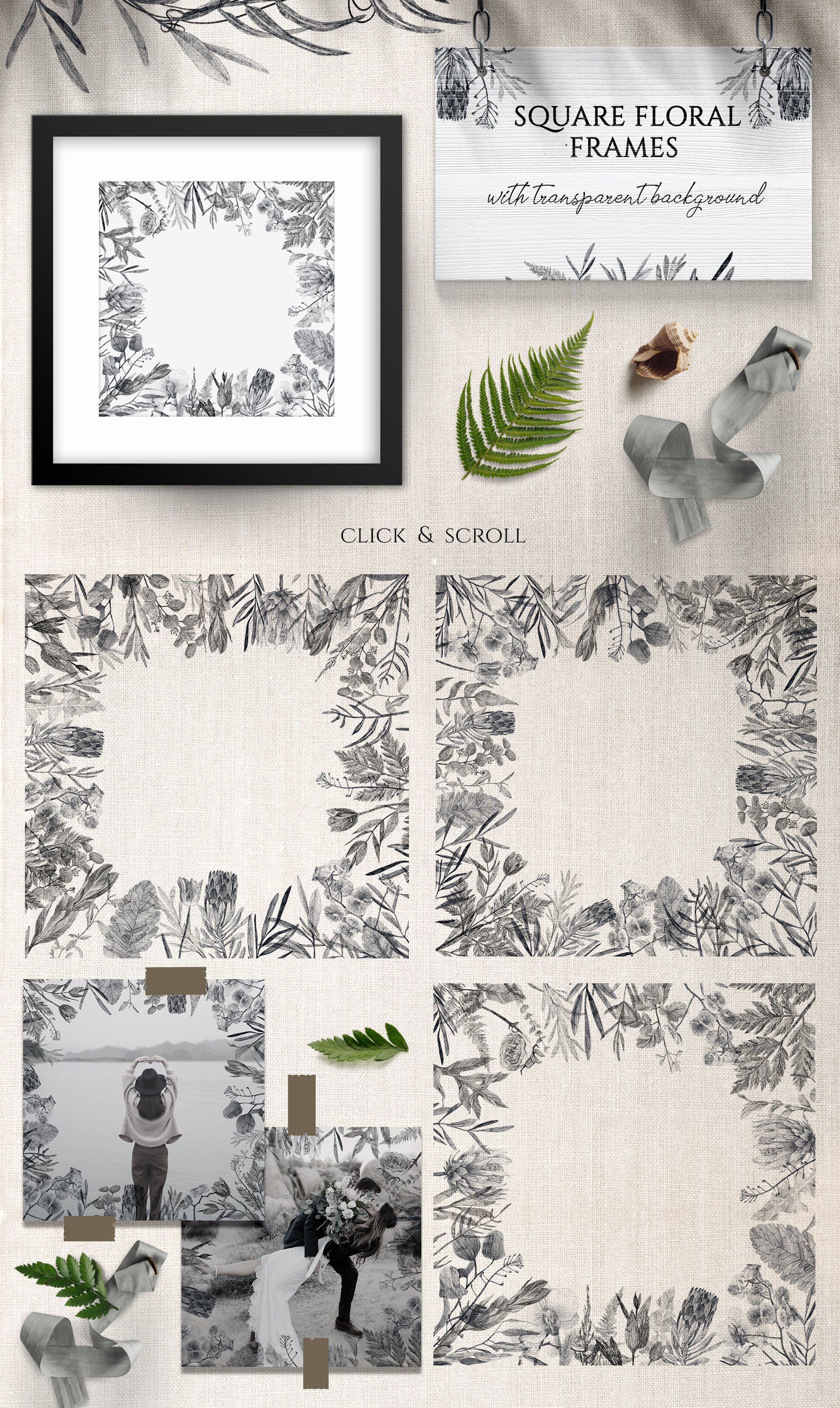 手绘植物插画的铅笔素描花卉收藏。精致的叶子和花朵用铅笔绘制。它由许多个单独的铅笔素描元素组成,具有不同类型的填充,轮廓,花束,花环,花卉几何框架,线框,方形花卉图案和无缝图案,可以单独使用或与其他元素组合使用。