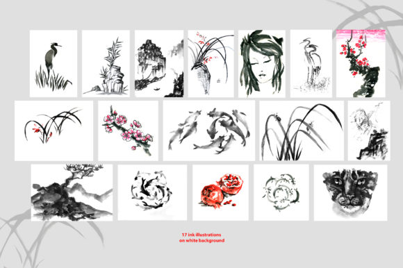 日本风格水墨剪贴画,这套高质量的手绘图像可用于:数字或纸质剪贴簿、家居装饰(墙上的绘画,枕头,毛巾,餐巾纸上的印刷品)、时装(织物的T恤,手提袋,围裙)和其他DIY项目。