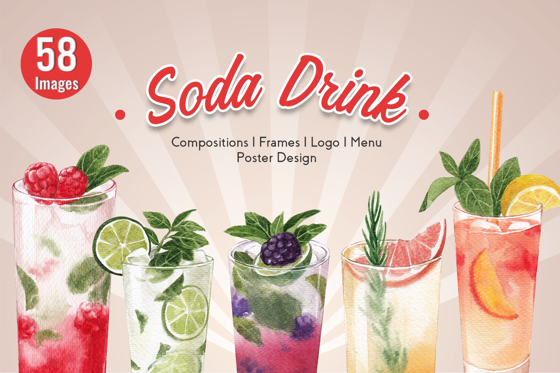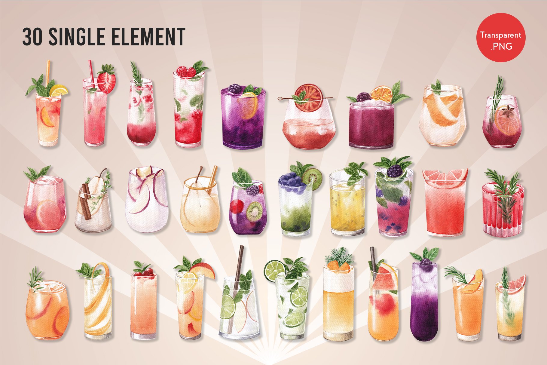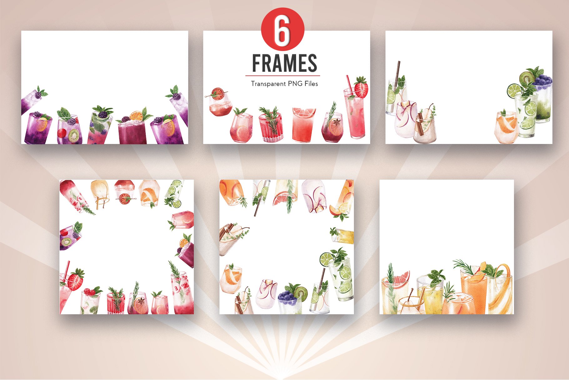 该混合水果汽水水彩插画集包含60个文件;为获得最佳质量,所有元素均为高分辨率300 DPI所有PNG文件均具有透明背景。包含海报、框架、徽标、图案等元素。