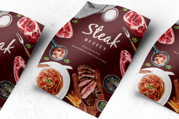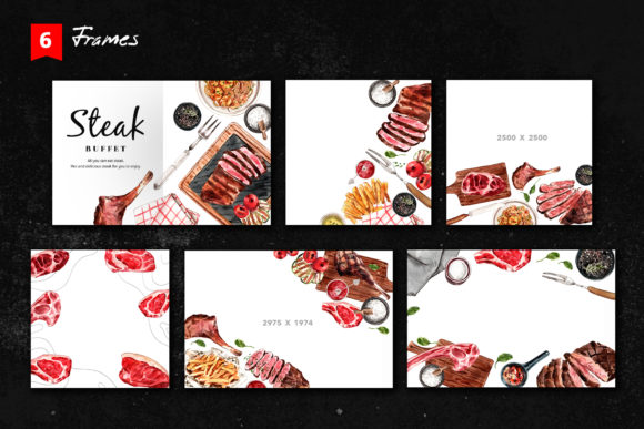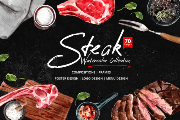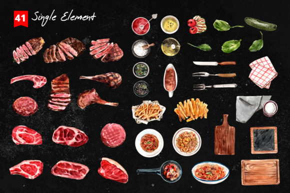 牛排晚餐美食水彩插画素材,这套文件包含60+个文件;为了获得最佳质量,所有元素均为高分辨率300 DPI,所有PNG文件均具有透明背景。