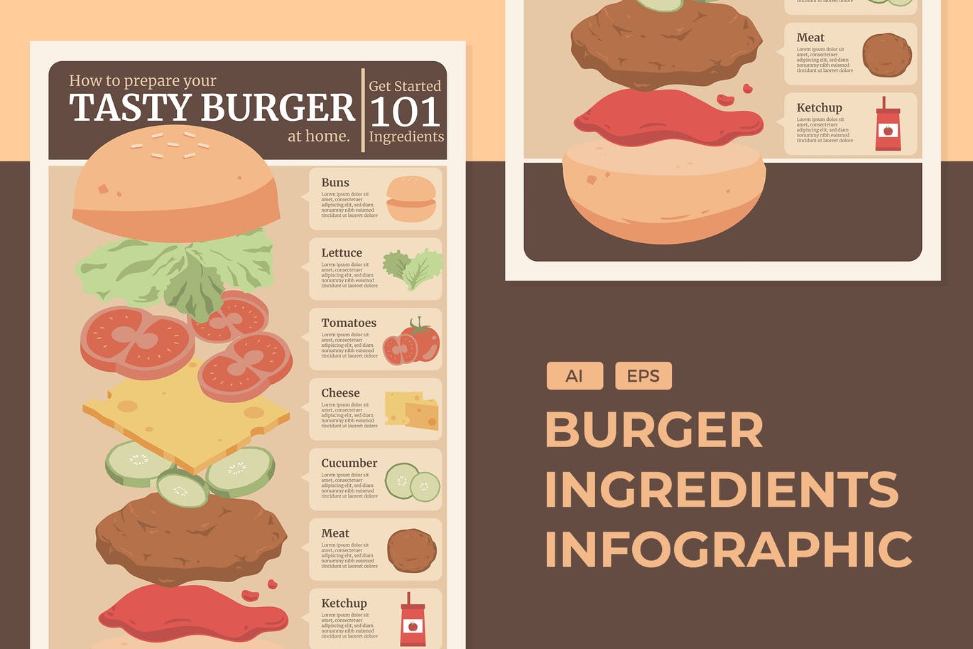 这次分享的是,汉堡分层食品信息图表矢量插图插画海报设计-AI,EPS,这是一个有关汉堡成分的食物信息图表,您可以将其用于饮食,医疗保健,教育等等,因为此信息图表是完全可编辑的。