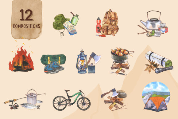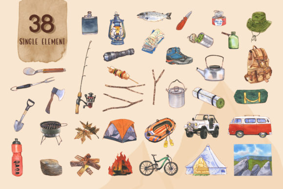 露营旅行水彩剪贴画素材集,此套装包含60+个文件;为获得最佳质量,所有元素均为高分辨率300 DPI。所有PNG文件均具有透明背景。感谢您对水彩奇观的热爱。