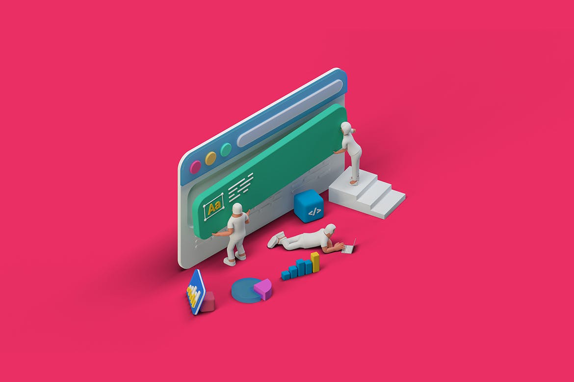 这次老不湿分享的是,时尚高端3D立体2.5D等轴等距插画场景-PSD,PNG,JPG,轻松更改背景颜色,分开的阴影,4k分辨率。