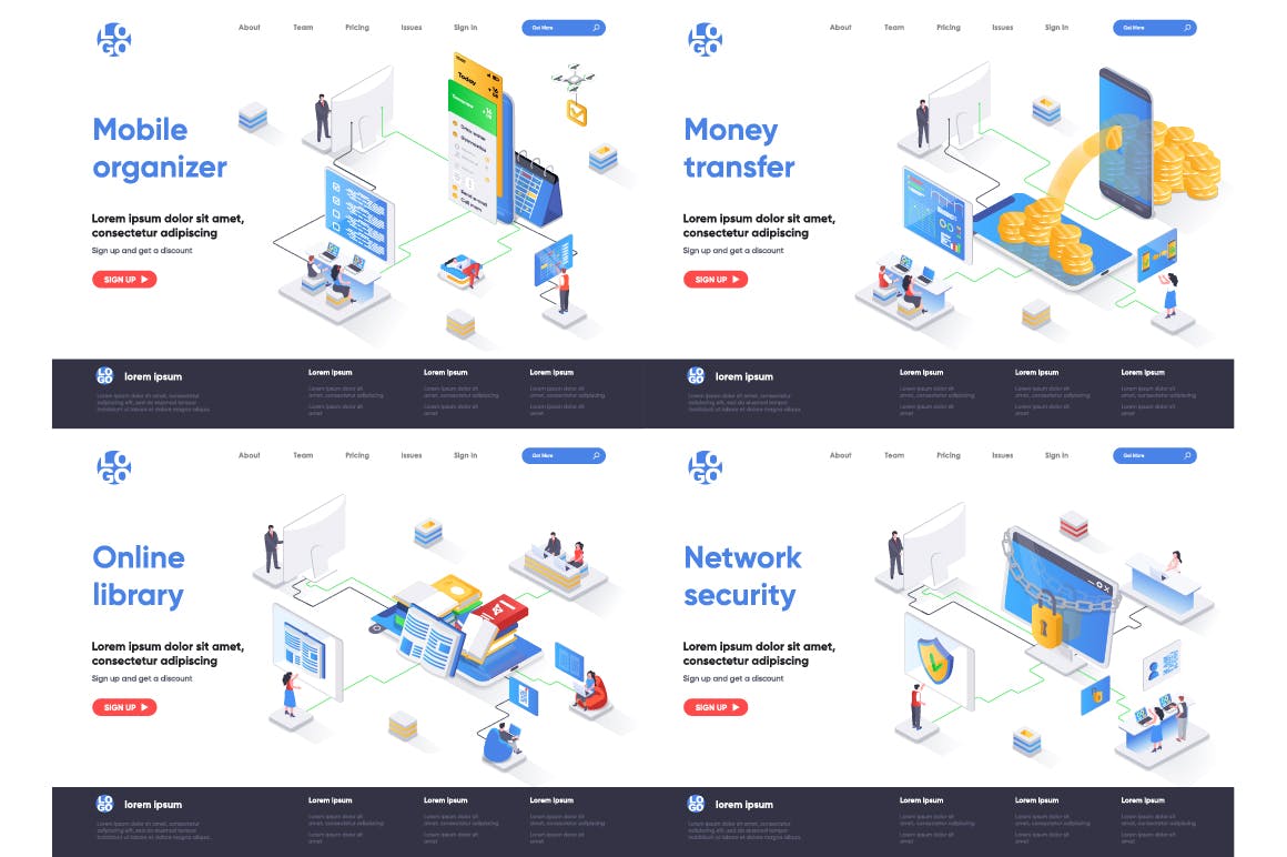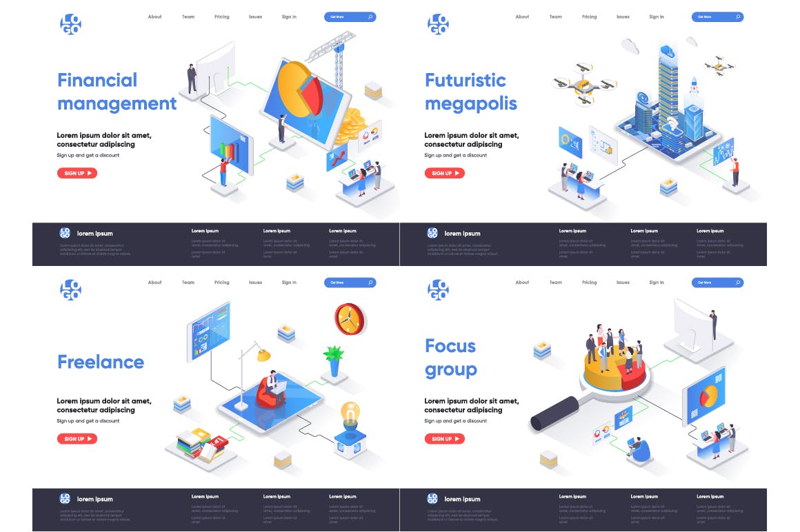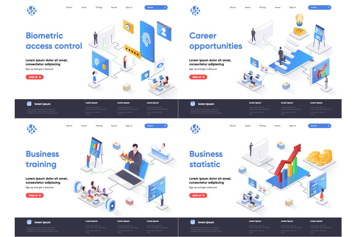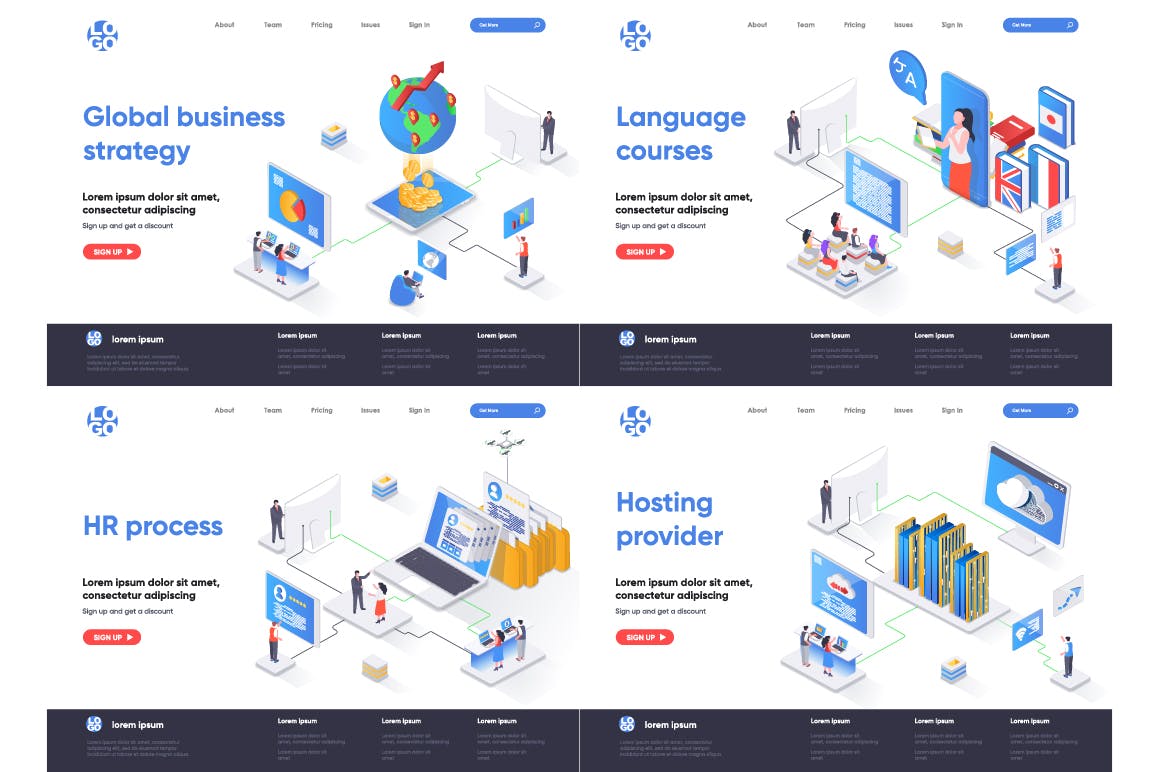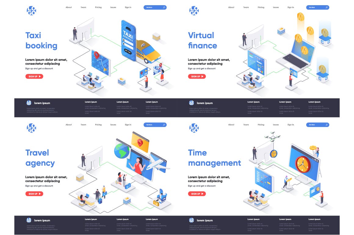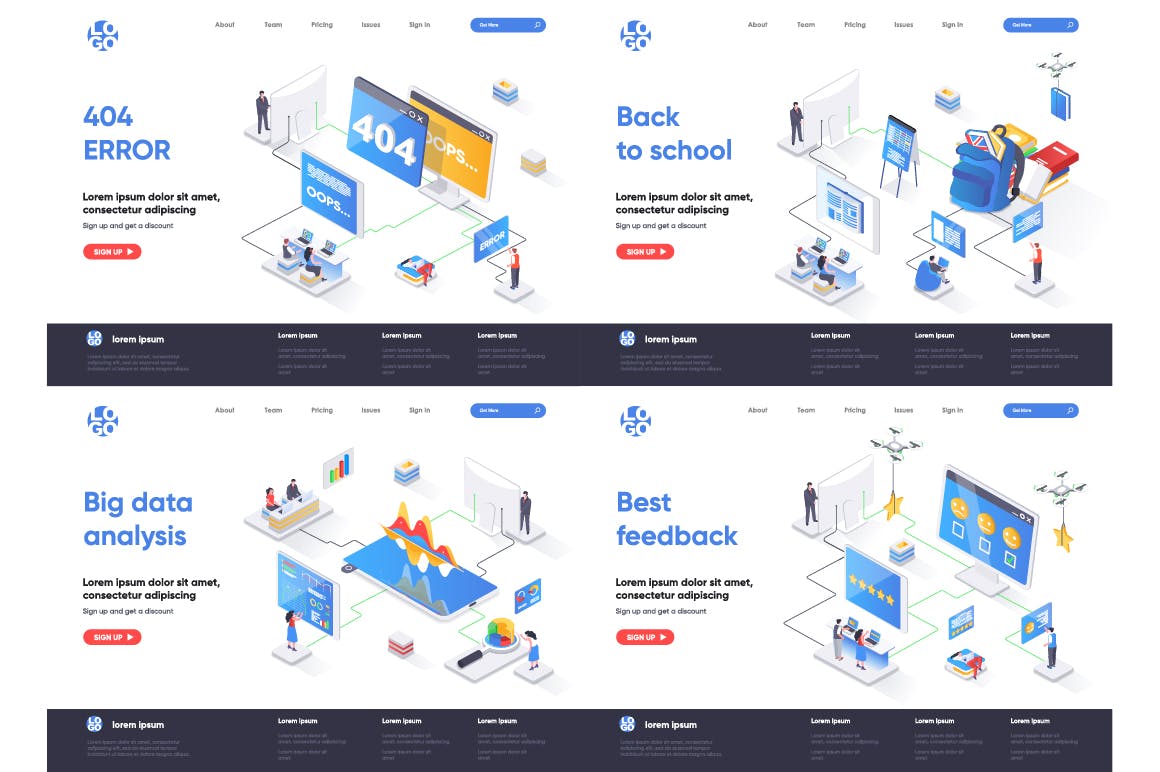 这次老不湿分享的是,2.5D等轴等距3D立体banner着陆页UI插画设计模板集合-AI,EPS,JPG,PNG,PDF,SVG,现代平面等距设计概念的集合。着陆页模板。针对web和图形设计的概念矢量图。人物角色情况创建者套件。可以使用矢量插图适用于cms,引导程序,主题,网页,移动,英雄形象,ui和ux开发,页眉或页脚的网站插图。