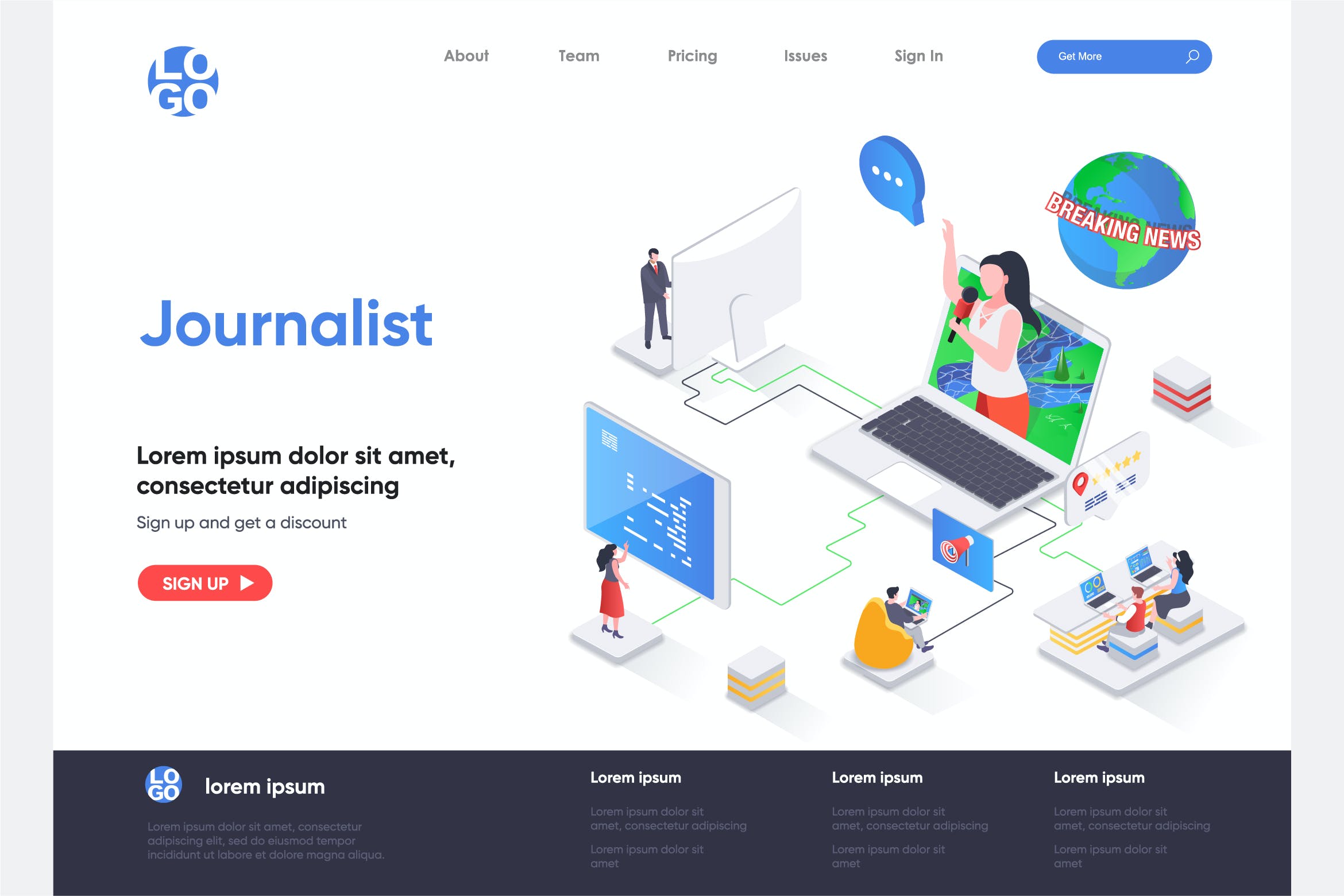 记者等距登陆页。突发新闻报道,在线访谈,电视广播,现场新闻发布等距网页。网站平面模板,具有人物特征的矢量插图。可用于矢量插图,适合cms,网页,或横幅,移动应用,英雄形象,和用户界面,主页。