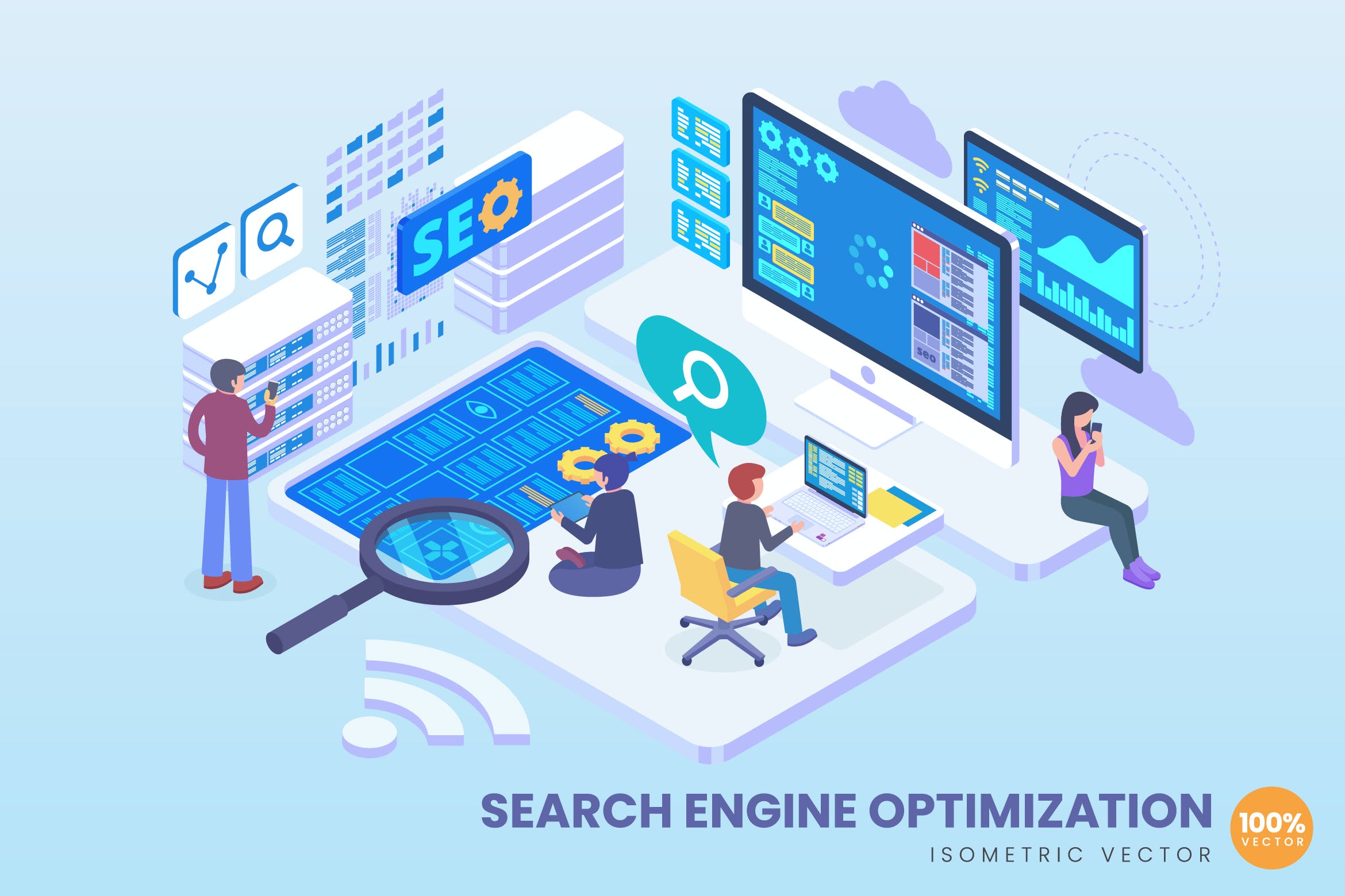 2.5D等轴测矢量资源始终具有视觉吸引力。无论是用于网络图形、登录页、横幅、图标、地图、信息图形、社交媒体、书籍,还是其他相关的插图用途,等轴测对象总是很好地符合您的项目目标。在这一系列中,我们精心设计并向您展示了搜索引擎优化等距向量的概念。这个华丽的概念是100%矢量,你可以调整成任何大小的矢量人工智能文件,而不失去其质量。希望你喜欢:)