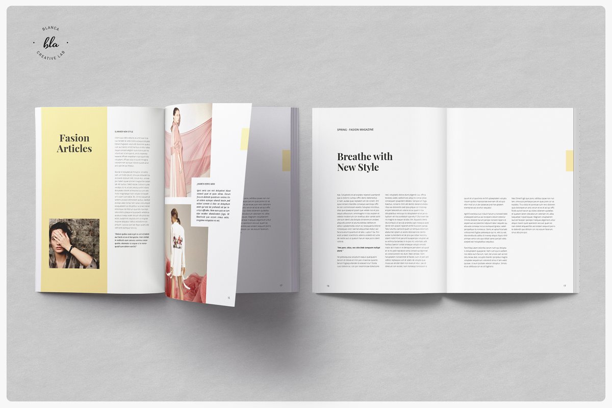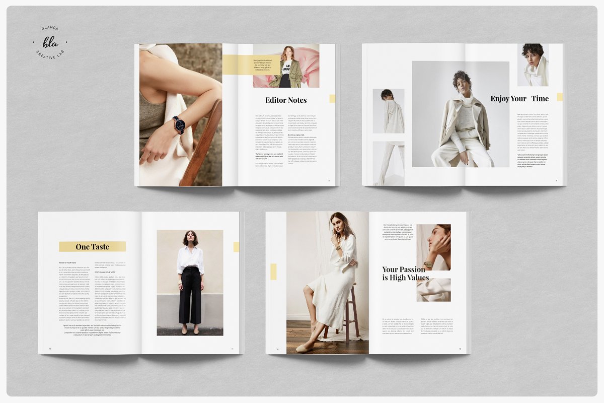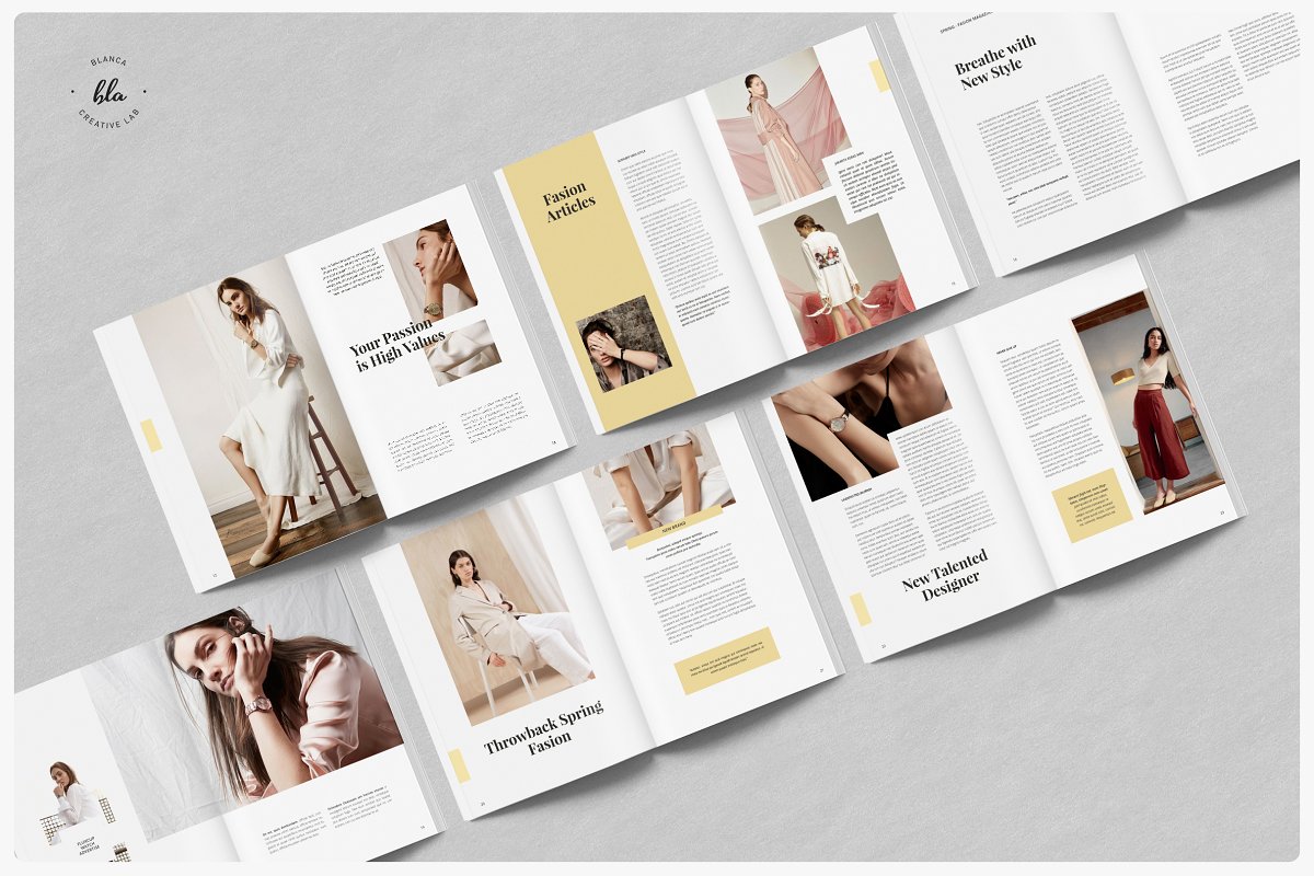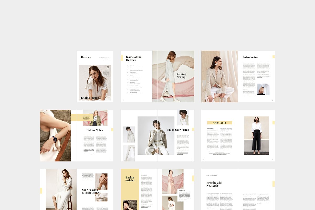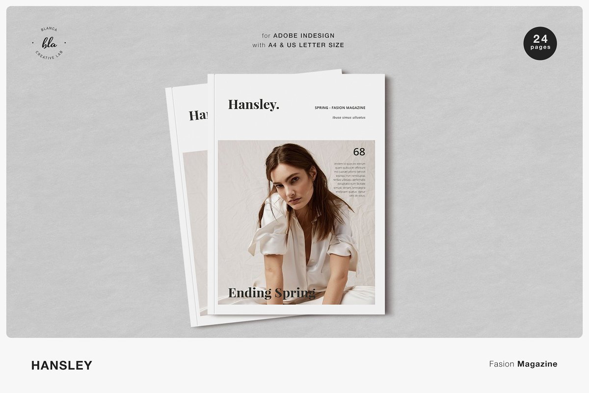 HANSLEY女性时尚杂志设计模板,具有分层图像,大胆的图形元素和闪烁的色彩。布局极简、间隔精美、优雅。预览图像以空白显示,但使用调色板(包含的帮助文件中的说明)更改颜色非常简单。