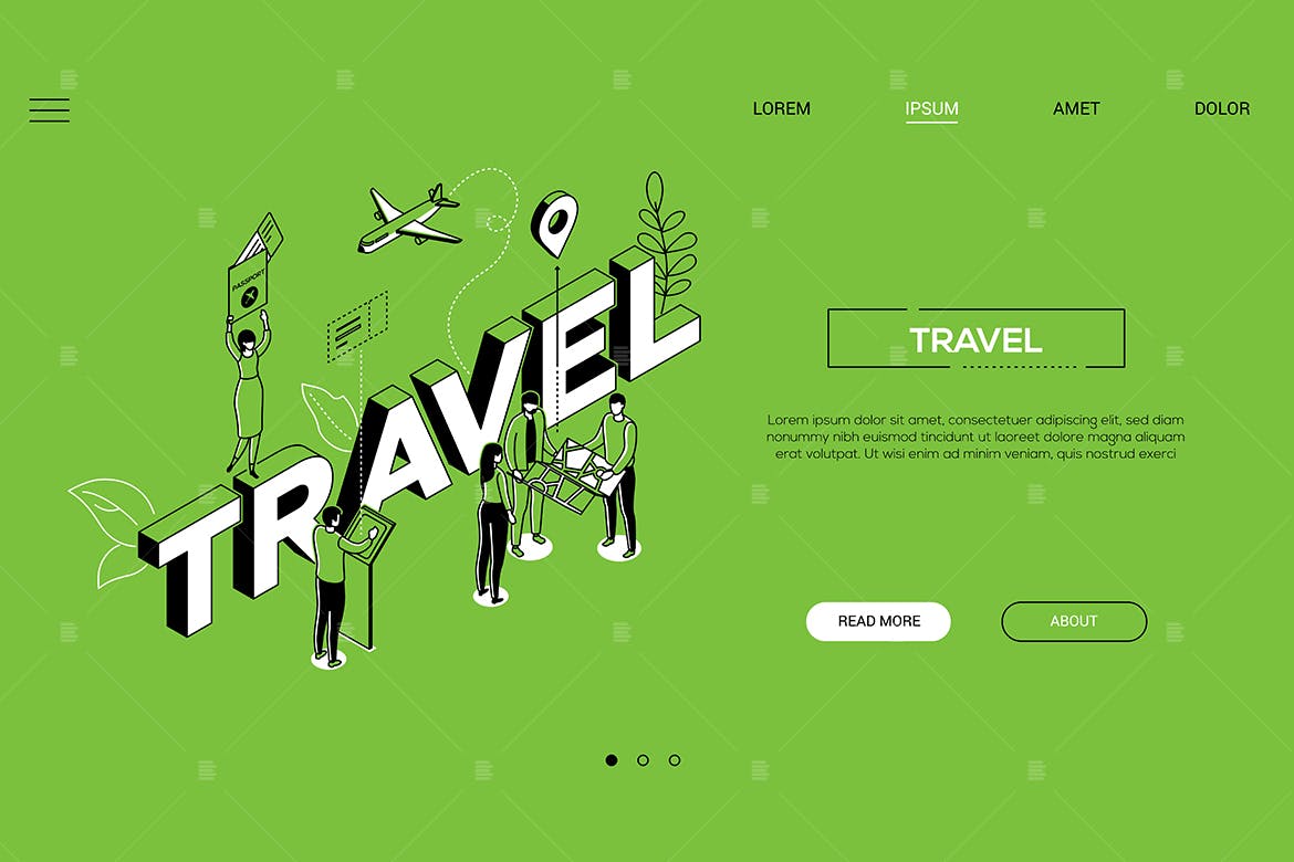 这次分享的是,旅行时间着陆页模板(EPS),旅行时间登陆页面。选择目的地,预订机票等距词概念web横幅。概述游客。假期旅行,旅程3d网站页面设计布局。