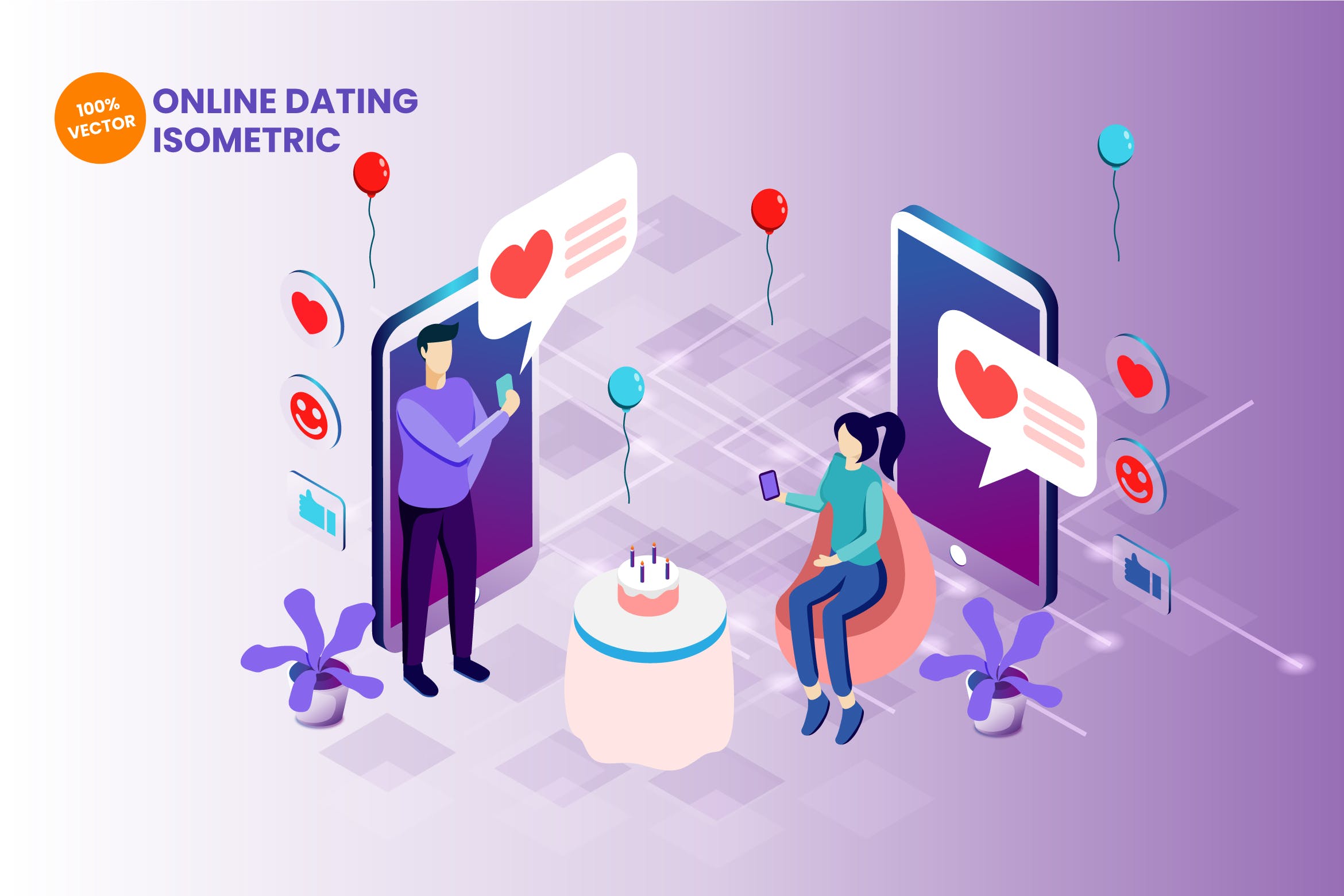 我们精心制作始终具有视觉吸引力的高质量等距向量资产。 在本系列中,我们向您展示在线约会矢量图。 您可以将其用于您的项目,例如网络图形,着陆页,横幅,图标,地图,信息图表,社交媒体,书籍和其他相关的插图用途,并且对于您的项目目标总是很棒。