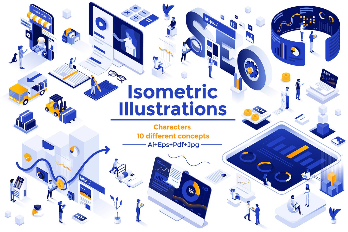 这次老不湿分享的是,时尚高端3D立体2.5D等轴等距大数据banner海报着陆页插画设计模板(AI,EPS,JPG,PDF),现代平面设计等距图上各种主题。可用于网站和移动网站或登录页面。易于编辑和自定义。向量例证