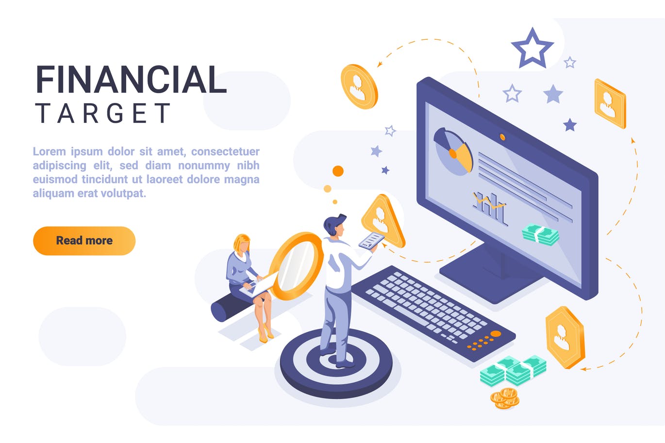 这次老不湿分享的是,时尚简约流行风格的3D立体2.5D等轴等距金融大数据banner海报插画着陆页设计模板,财政目标着陆页与等量例证的传染媒介模板。金钱目标首页界面布局与等距。企业成长,业务目标3d网页设计理念