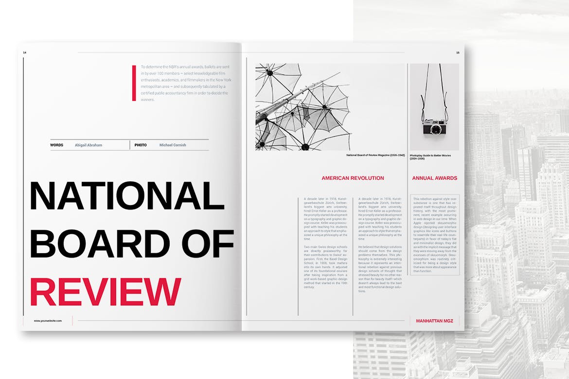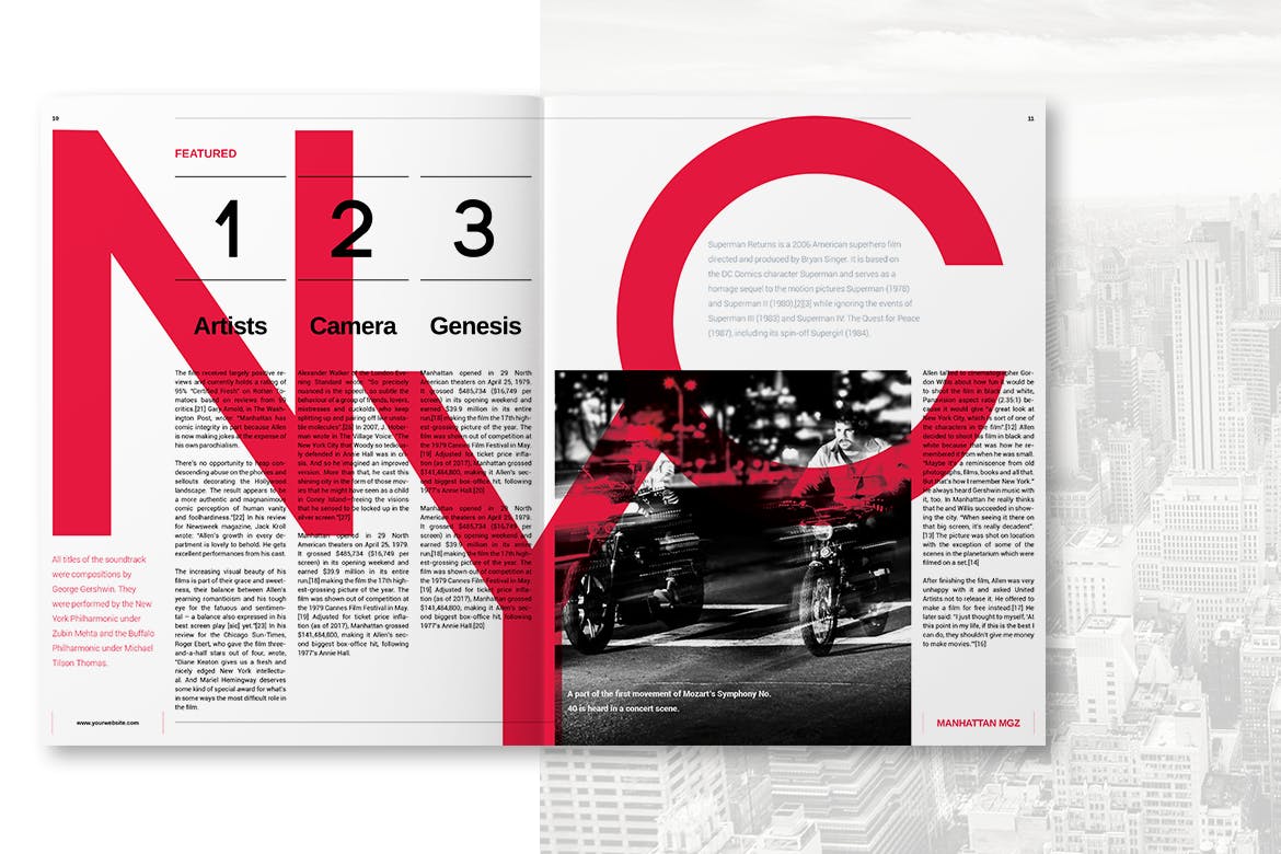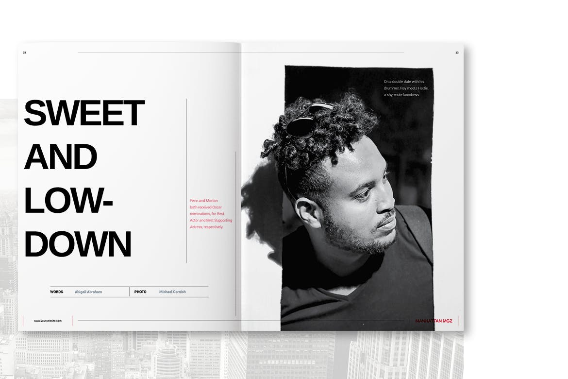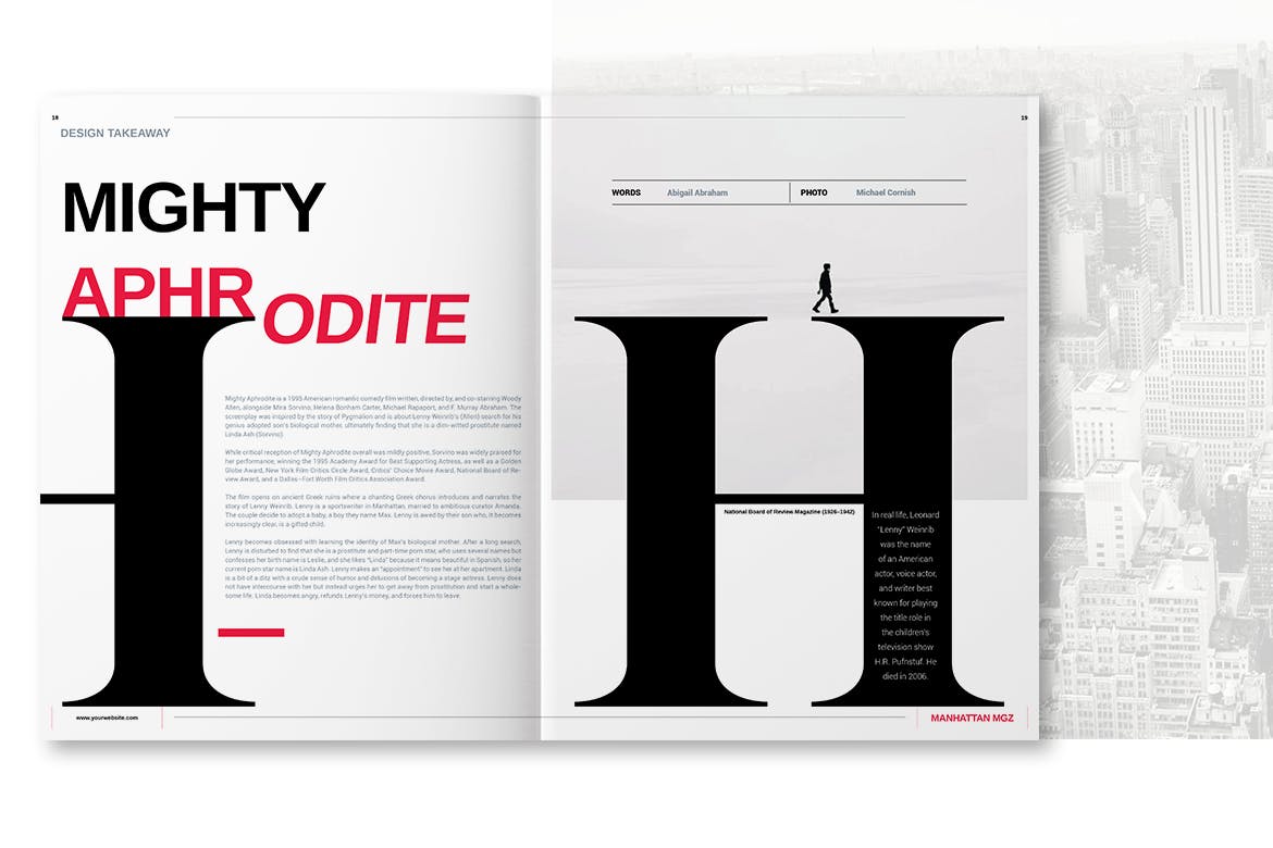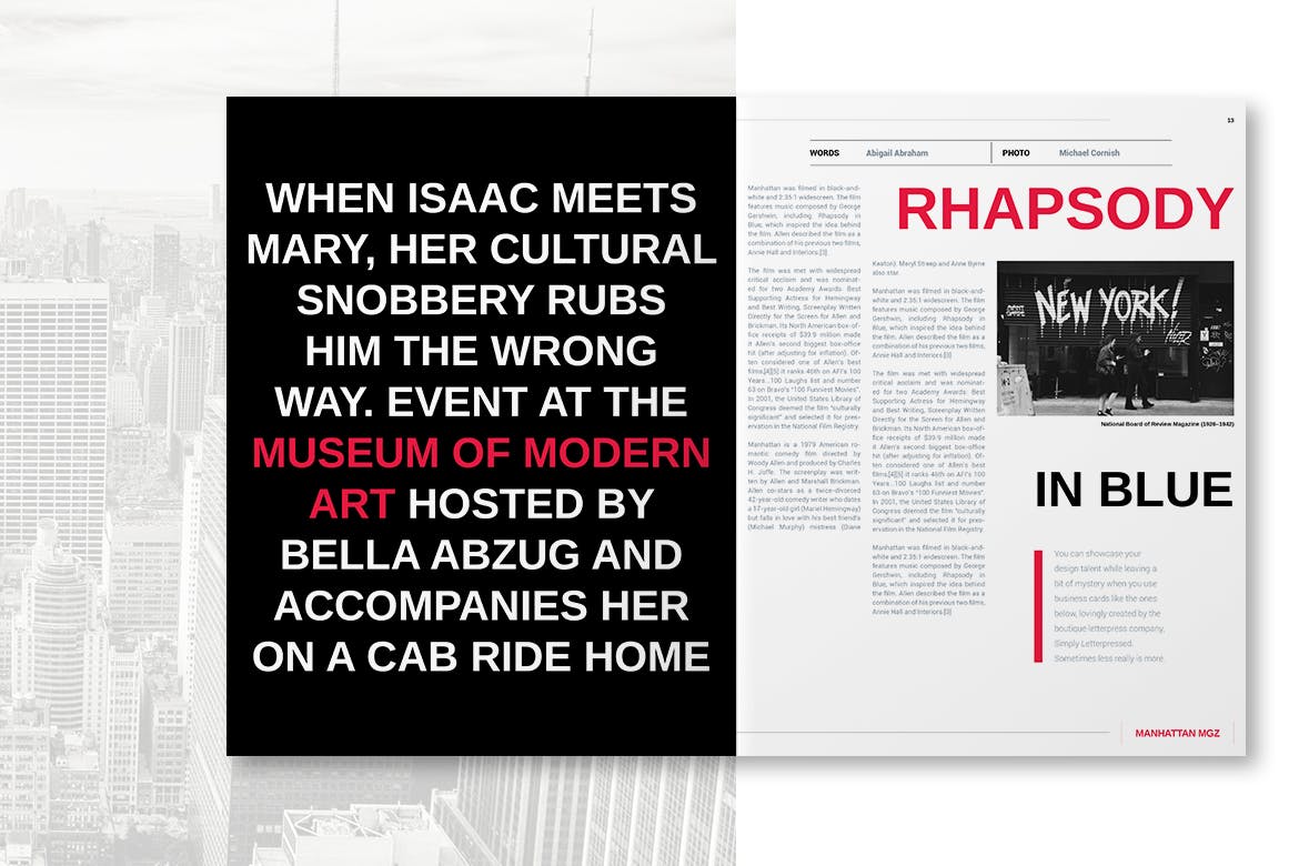 这本杂志主要是功能性的,提供免费字体和来自世界各地的照片和作者的精彩图像。该杂志的灵感来自纽约市,黑白电影和伟大的艺术家伍迪艾伦。